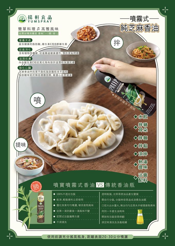 使用方式:適合涼拌增香、提鮮,水餃提味防沾黏、拌豬耳朵、拌麵、拌餡、熱湯提味、沾醬配料、炒菜、燉煮、氣炸鍋等料理使用,亦可外出露營野餐。