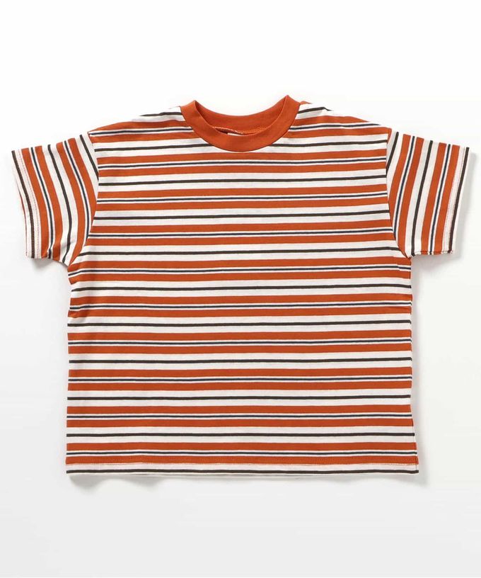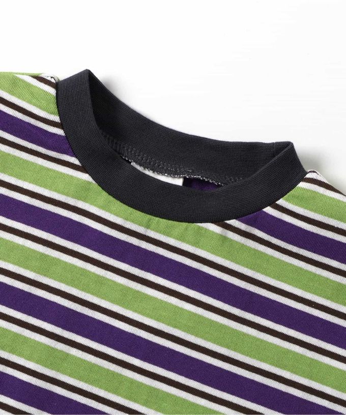 日本 BREEZE - 100%棉 百搭條紋落肩短袖上衣-棕X薄荷綠X粉紅