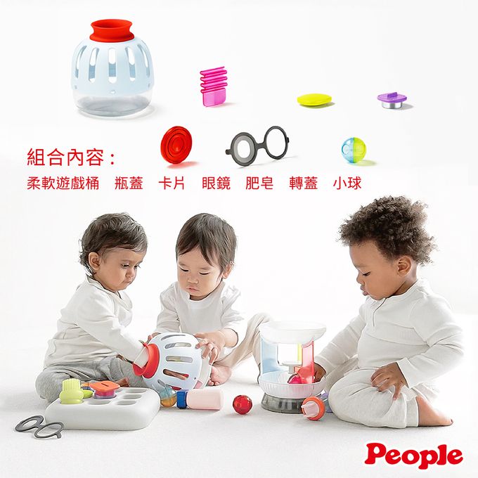 內附柔軟遊戲桶、蓋子、卡片、眼鏡、肥皂、罐子及小球配件,孩子可隨著自己的方式玩耍,探索形狀、觸感、洞口大小,反覆拿進拿出,創造出屬於自己的遊戲方式,每一次探索都是想像力的延伸!