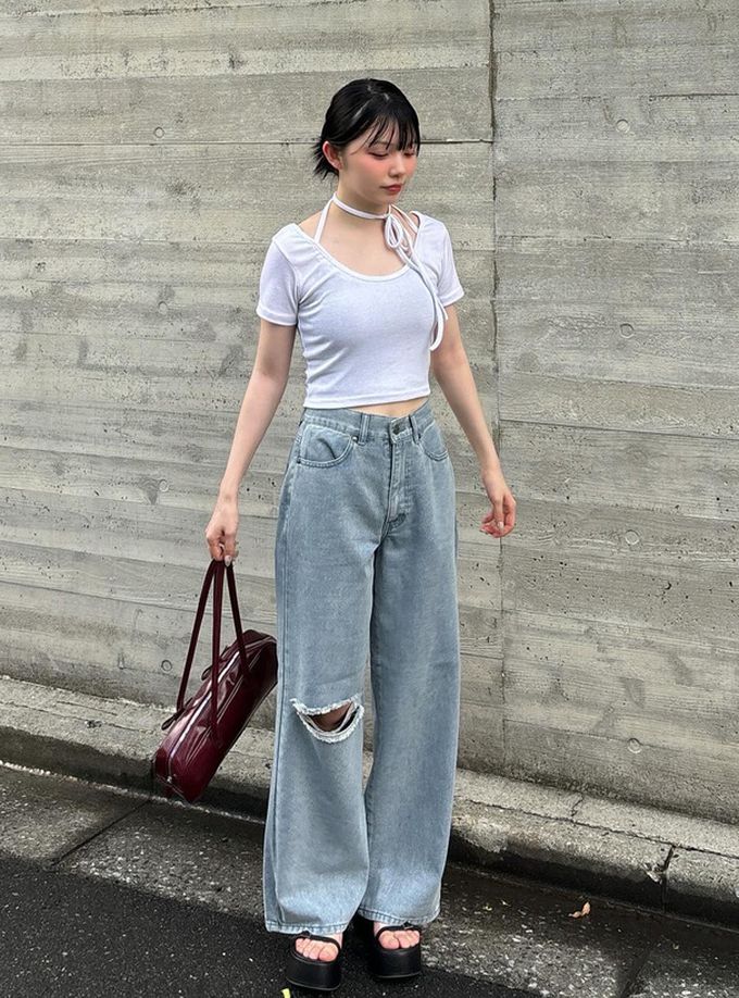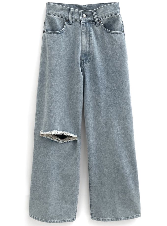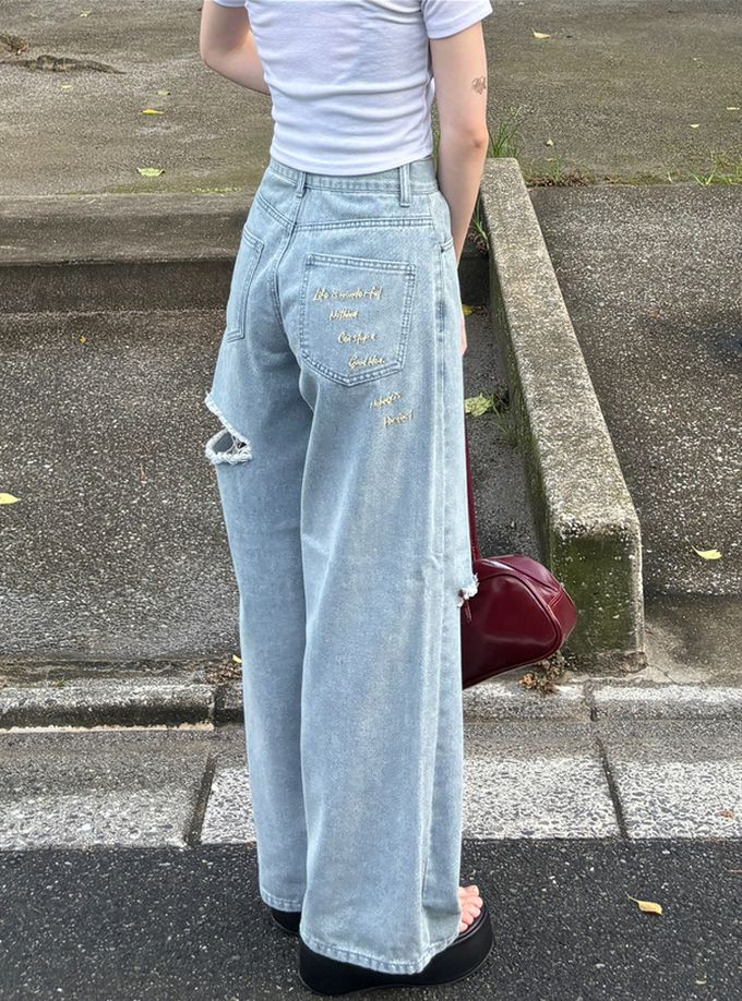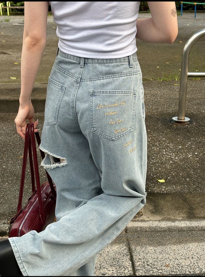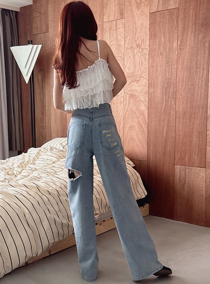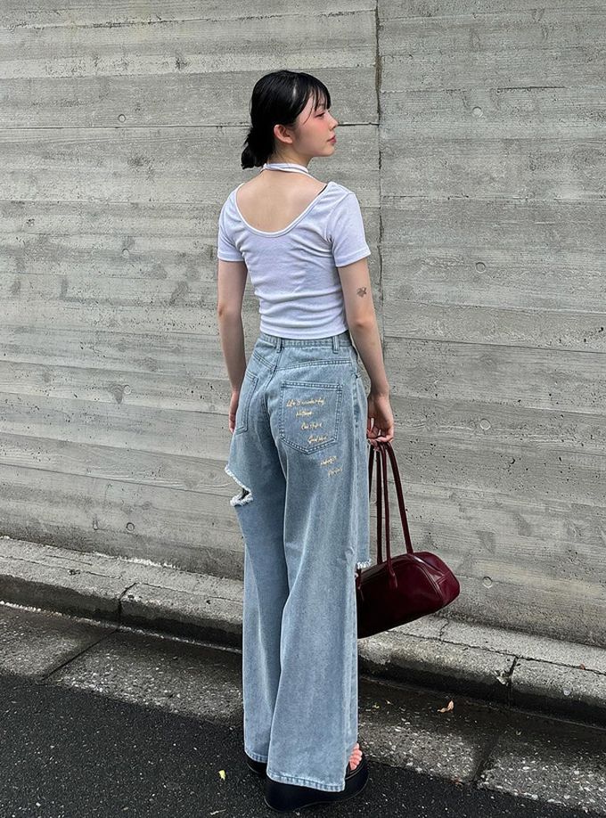 • 品名:背後英文刺繡性感挖洞丹寧褲