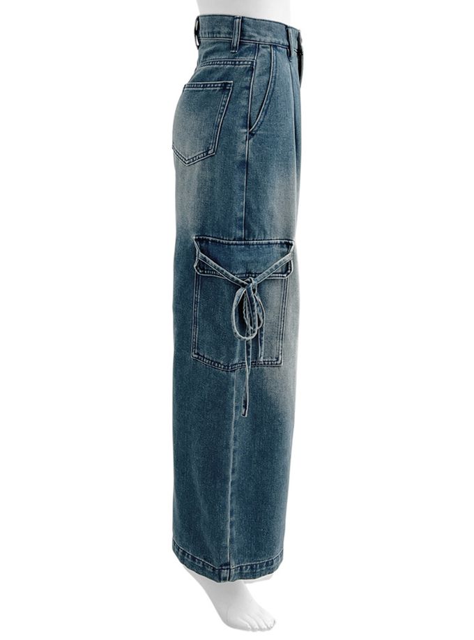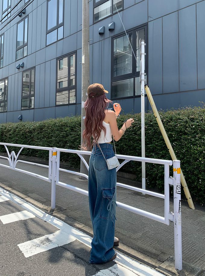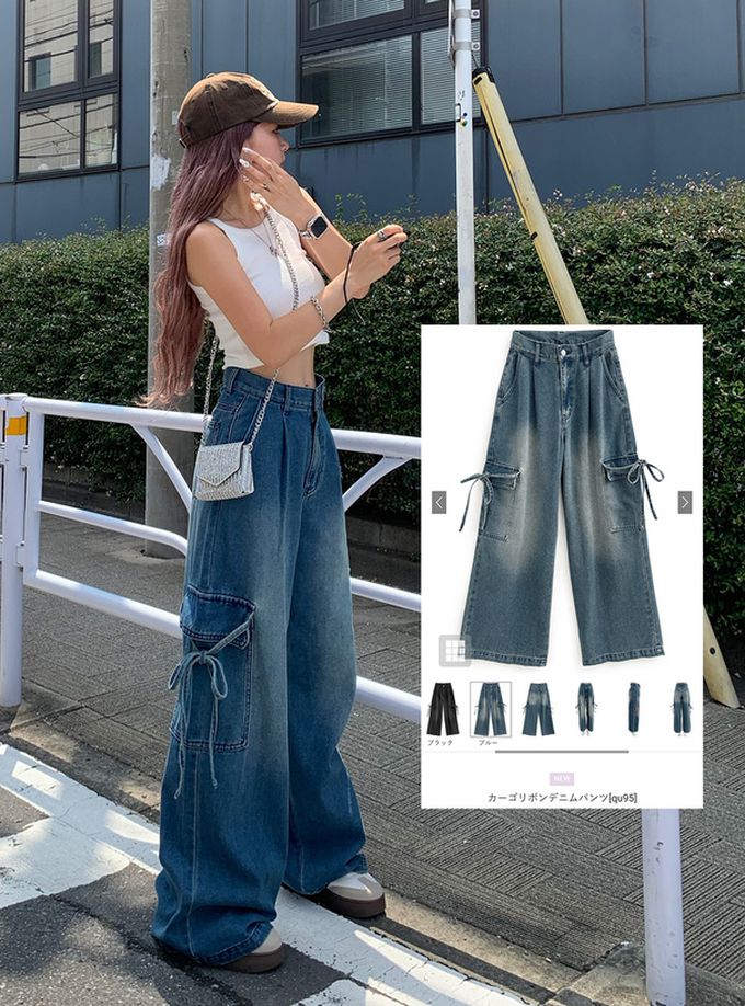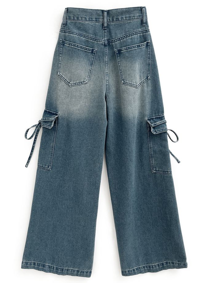• 品名:輕甜工裝風側綁帶寬版牛仔褲