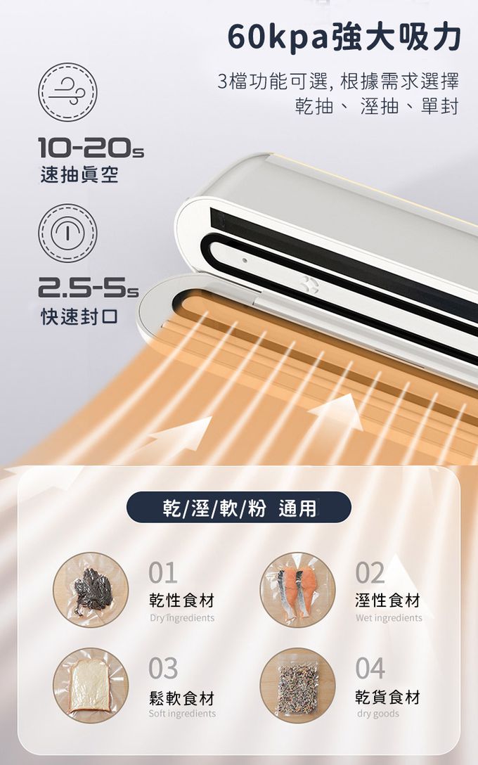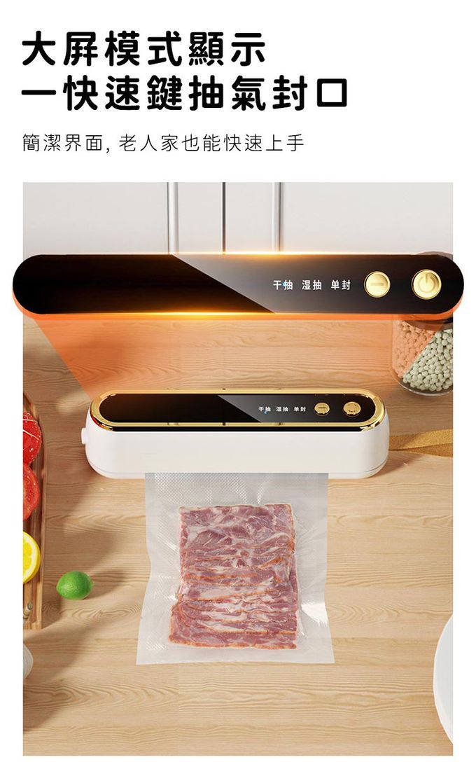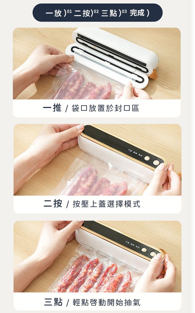 注意事項:1.商品到貨享鑑賞期之權益,鑑賞期並非試用期,辦理退貨商品必須是全新狀態且紙箱及商品配件包裝須完整。 2.商品一經使用或組裝後,恕無法辦理退換貨。 3.商品為人工丈量略有1~3公分內誤差,請以實品為主。 4.商品圖為情境示意圖,本商品內容不包含擺飾物品。 5.請於通風陰涼處晾乾,遠離過於潮濕地方。 6.本產品請遠離火源,不要放在火旁邊或高溫的地方。 7.網頁商品會因面板螢幕解析度不同,造成圖片顏色呈現略有不同,請以實品顏色為準。 8.存放在乾燥處,避免潮濕導致電池及產品損壞。 9.不可自行拆解或改裝產品,以免引發故障或危險。 10.勿讓小孩操作或玩耍,避免燙傷。 11.充飽電後請拔除電源,長時間接電、尤其在高溫、潮濕環境下,可能增加短路或火災的風險。 12.封口加熱條在運作時會非常高溫,請勿用手直接觸摸,以免燙傷。 13.將袋口平整放入封口線位置,以確保密封良好。 14.一次封一個袋口,不要一次封多個袋子,避免封口不完全。 15.保持壓合約1-2秒後再放開,讓封口線冷卻、凝固。 16.袋內勿過滿:預留3~5cm空間在袋口,避免食物被吸入機體或造成封口不完全。