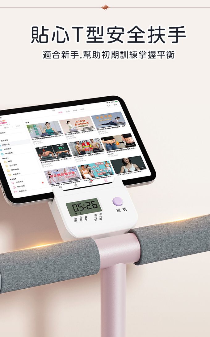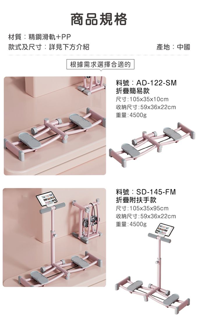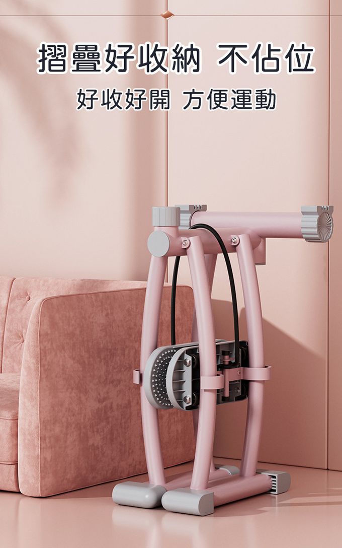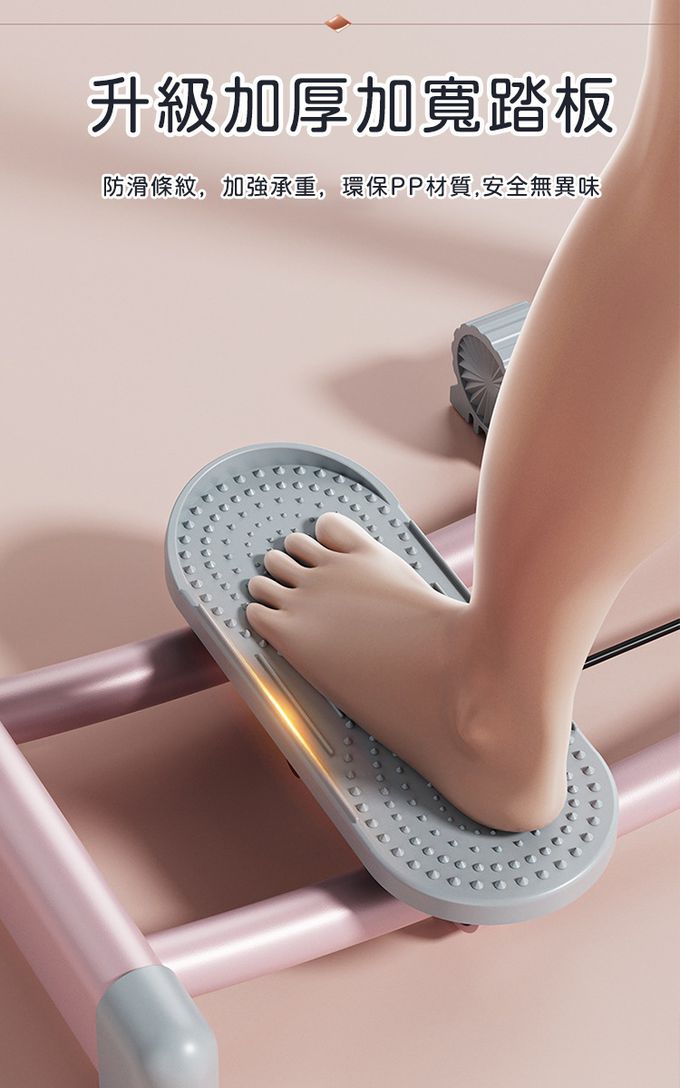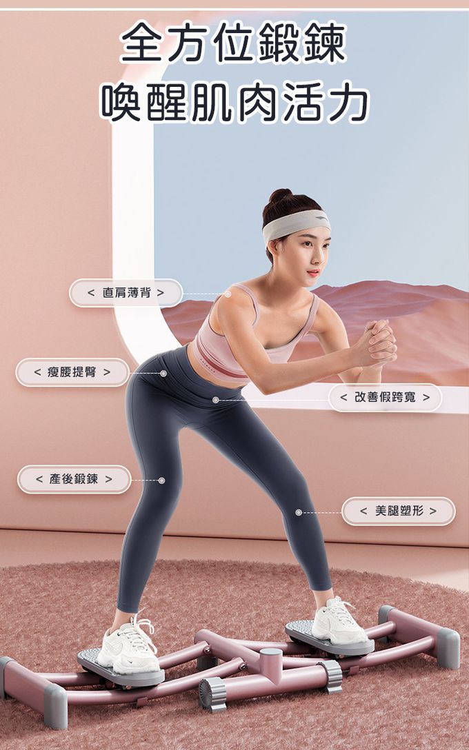 注意事項:注意事項 1.商品到貨享鑑賞期之權益,鑑賞期並非試用期,辦理退貨商品必須是全新狀態且紙箱及商品配件包裝須完整。商品一經使用或組裝後,恕無法辦理退換貨 2.請確認商品是否有龜裂或破損,如有異常請勿使用。 3.網頁商品會因面板螢幕解析度不同,造成圖片顏色呈現略有不同,請以實品顏色為準 4.商品為人工丈量略有1~3公分內誤差,請以實品為主。 5.請放置於通風乾燥處,遠離過於潮濕地方。 6.建議穿著運動鞋使用,增加穩定性並保護腳踝。 7.初次使用請調整至最低阻力,熟悉動作再逐步增加強度。 8.每次使用建議控制在 10~20 分鐘/次,避免肌肉疲勞。 9.使用後請用乾布擦拭表面汗水,避免陽光直曬或潮濕環境存放。 10.若有膝蓋、骨盆或下背傷病,請先諮詢醫師後再使用。 11.本產品為健身輔助器材,實際效果因個人體質與使用習慣而異。