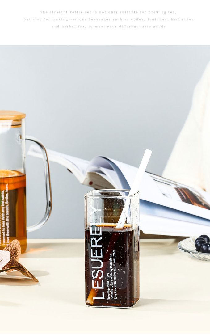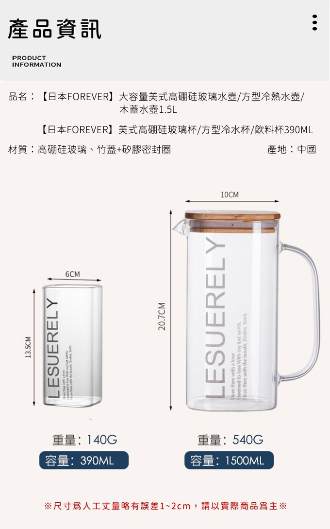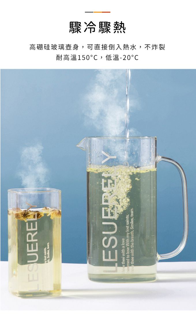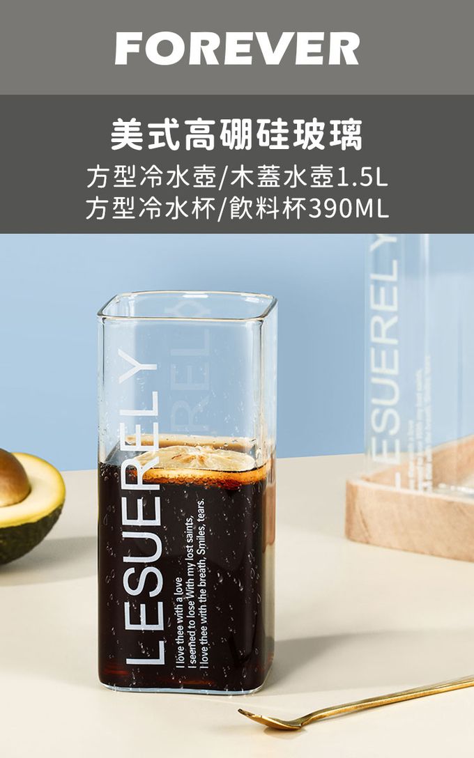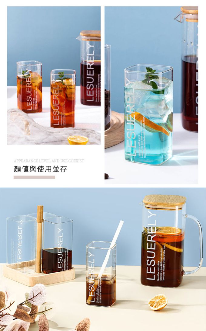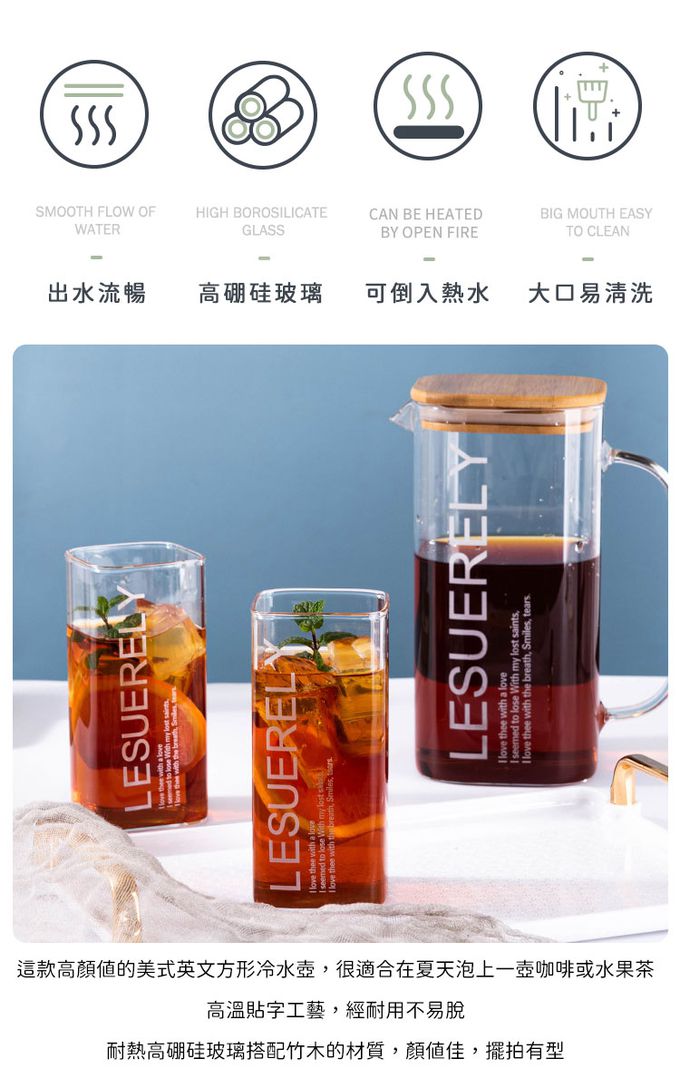 品名:大容量美式高硼硅玻璃水壺/方型冷熱水壺/木蓋水壺1.5L附2杯