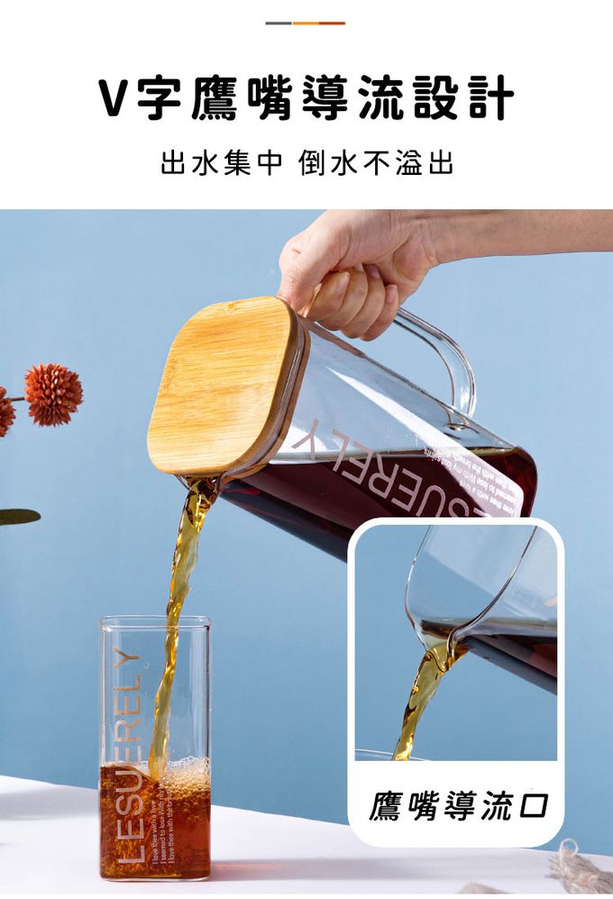 大容量美式高硼硅玻璃水壺/方型冷熱水壺/木蓋水壺1.5L附2杯