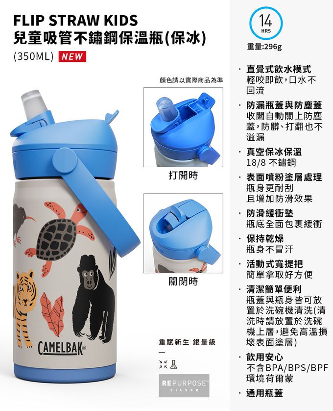 CamelBak - Flip Straw兒童吸管不鏽鋼保溫瓶 (保冰)-動物樂園 (350ML)-296G