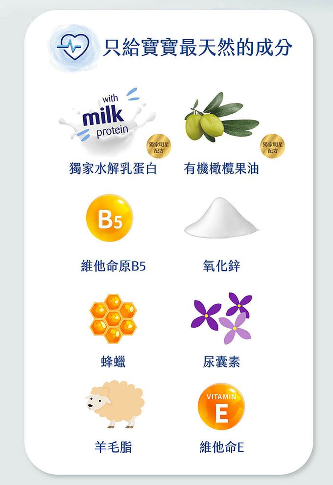 注意事項:產品容量:150ml 主要成分:獨家水解乳蛋白、有機橄欖果油、氧化鋅、羊毛脂、維他命原B5、尿囊素、維他命E、甘油 產地:德國 【注意事項】 ● 使用後若有肌膚不適情況,請立即停止使用。 ● 請置於陰涼乾燥處,避免陽光直接照射。 ● 使用方法:於清潔後,塗抹一層於乾淨的尿布區域,幫助鎮靜舒緩,阻絕刺激,修護及防止尿布疹產生。