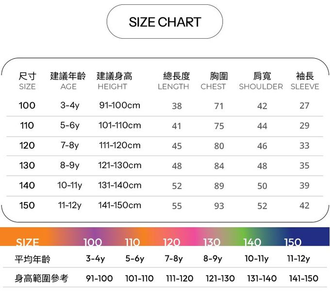 1. 尺寸表單位皆為公分(cm),實際尺寸會因布料彈性、水洗、測量起迄點等因素略有誤差。建議參考孩子平時穿著衣物尺寸進行選購。