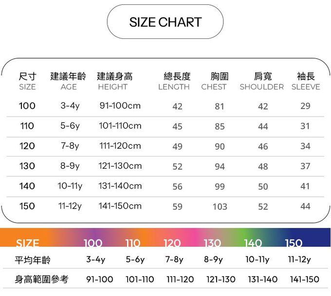 1. 尺寸表單位皆為公分(cm),實際尺寸會因布料彈性、水洗、測量起迄點等因素略有誤差。建議參考孩子平時穿著衣物尺寸進行選購。