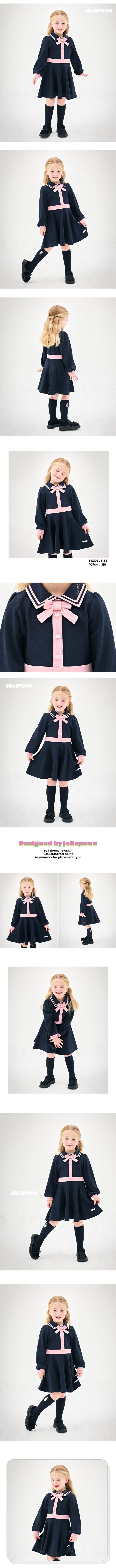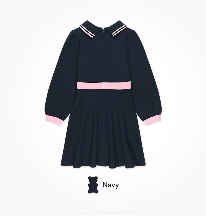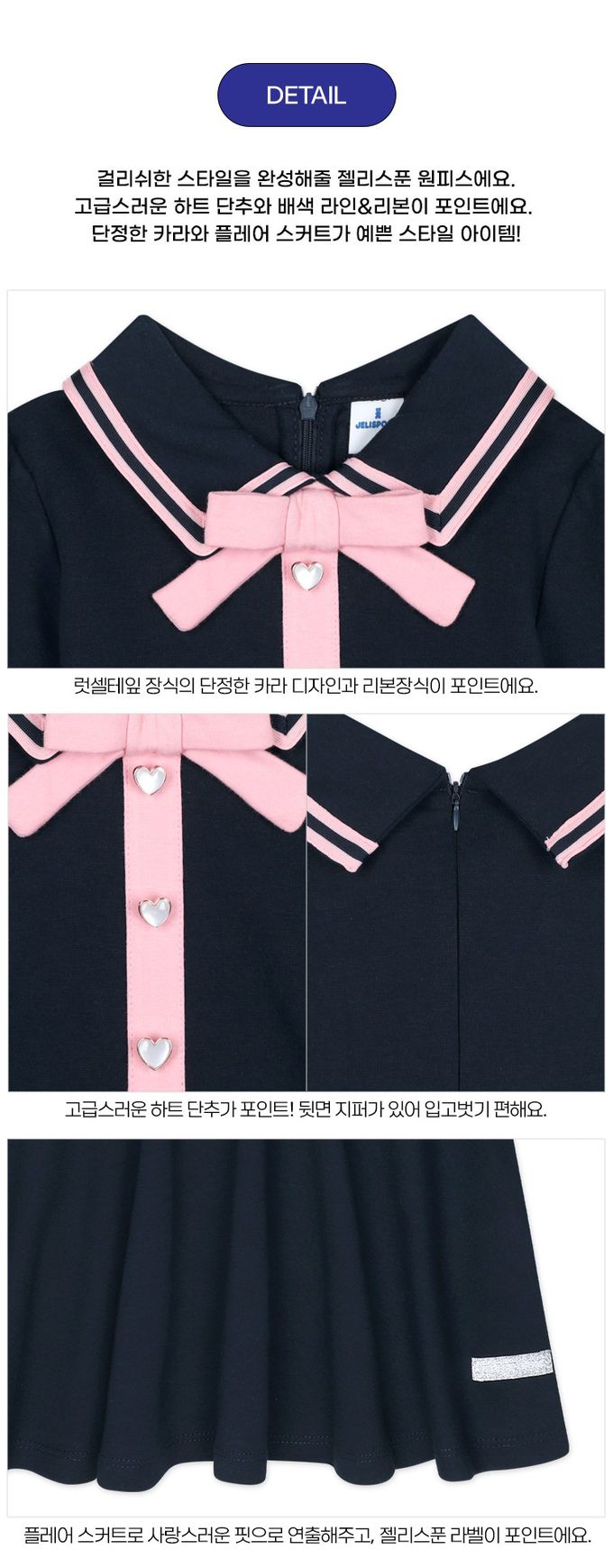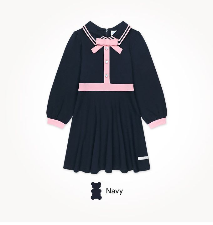 韓國 Jelispoon - 甜美緞帶裝飾愛心釦長袖洋裝-海軍藍X粉