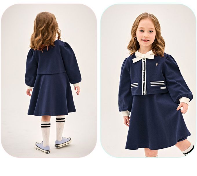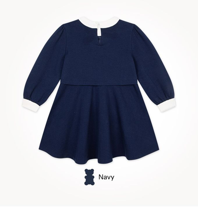 韓國 Jelispoon - 典雅緞帶裝飾珍珠釦長袖洋裝-海軍藍X白