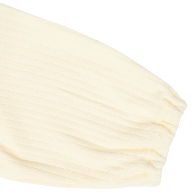 當小寶寶的雙腳開始會活潑地舞動時,可變換成分腳連身衣穿,衣服就不會往上掀開。