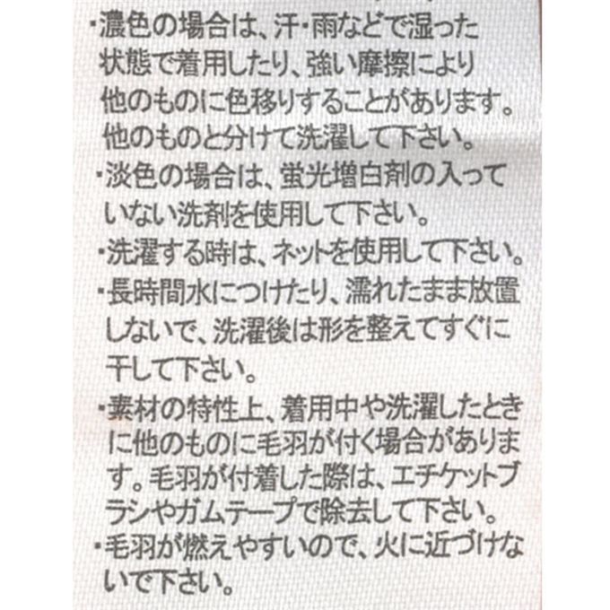 注意事項:●請使用不含螢光增白劑的洗劑。●請使用洗衣網。●穿著時或洗滌時若毛絮沾到別的物品上,請用衣物用除毛刷或衣物用毛絮黏把清除。●毛絮易燃,請勿靠近火源。●請勿使用柔軟劑。●每個幼童的成長曲線有所不同,因此標示上的適用年齡僅供參考,請選擇適合幼童身型的商品。