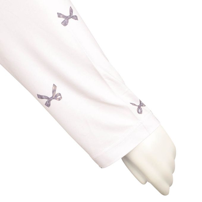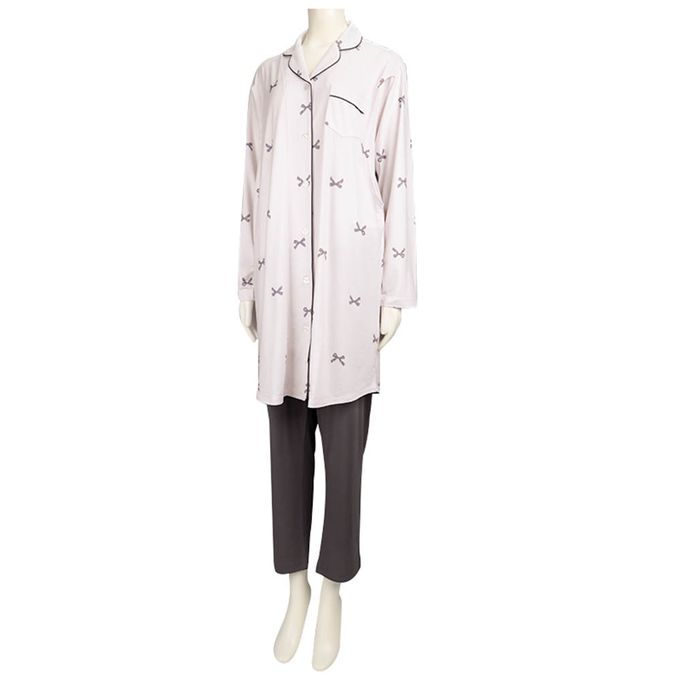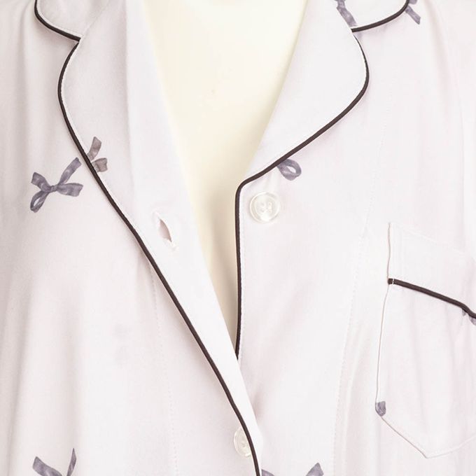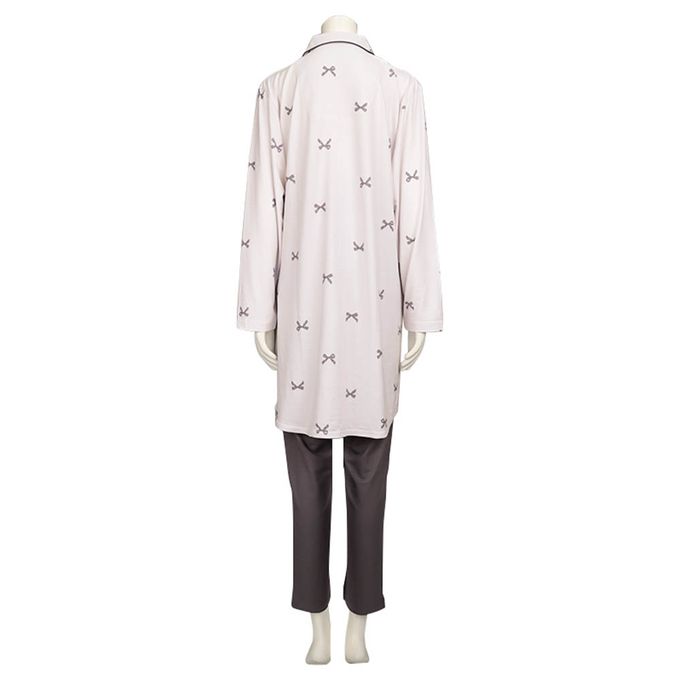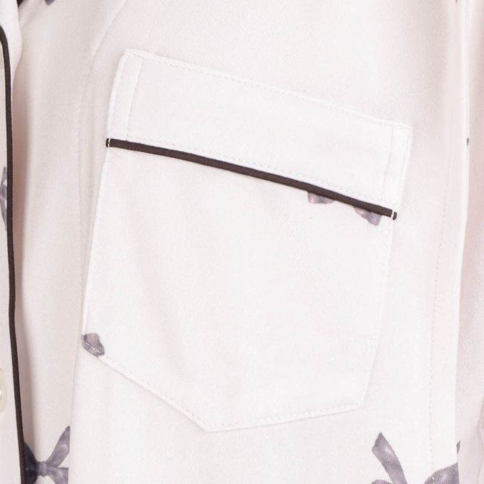 上衣為蝴蝶結滿版印花圖案,褲子為素面設計。