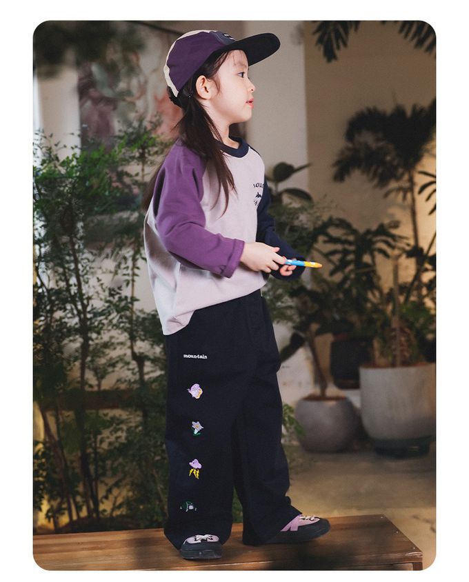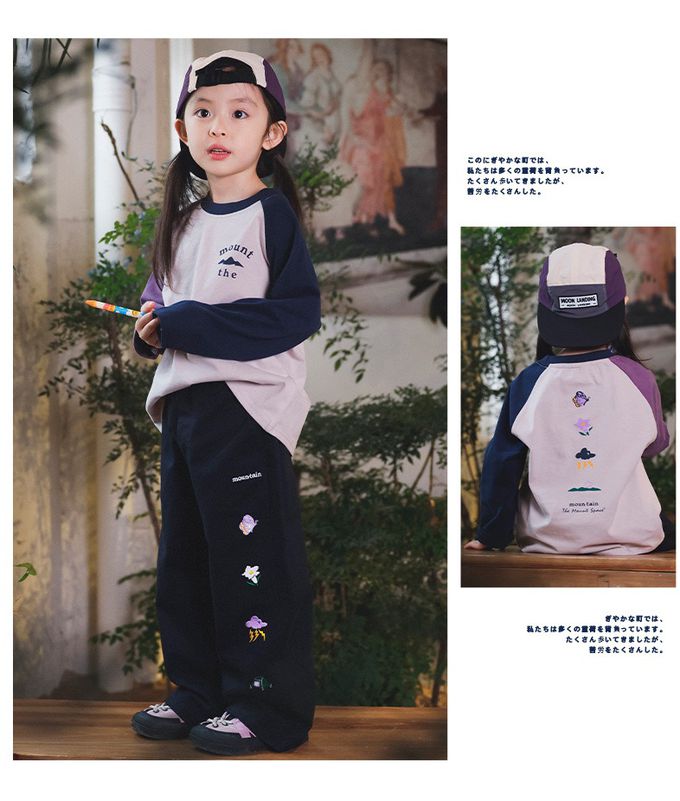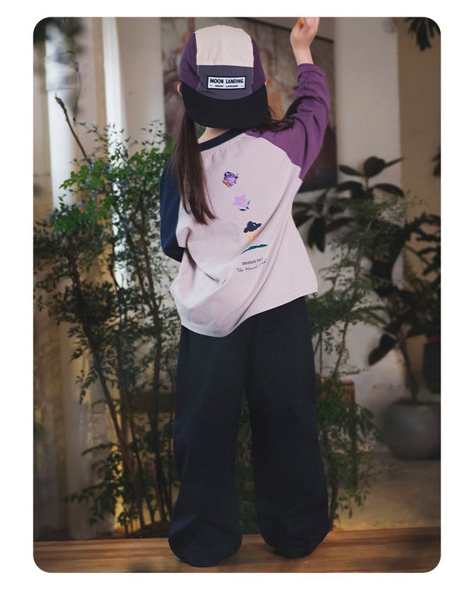純棉圓領長袖上衣-蝴蝶花卉-拼色灰杏