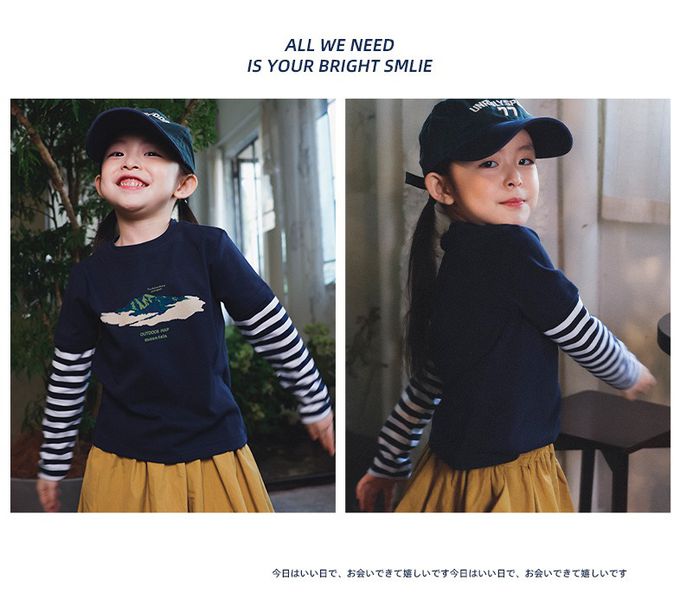 棉質圓領假兩件長袖上衣-條紋拼袖-藏青