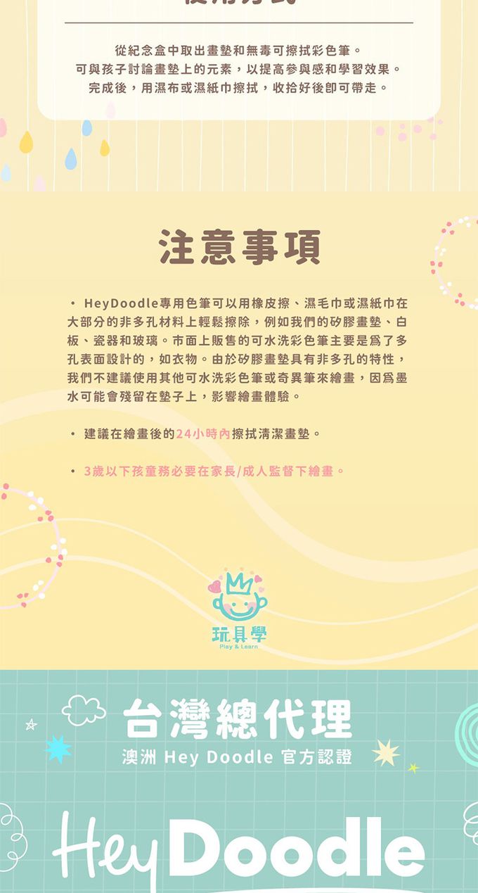 1.請勿使用可水洗彩色筆或奇異筆於矽膠墊上,墨水會殘留影響繪畫體驗。