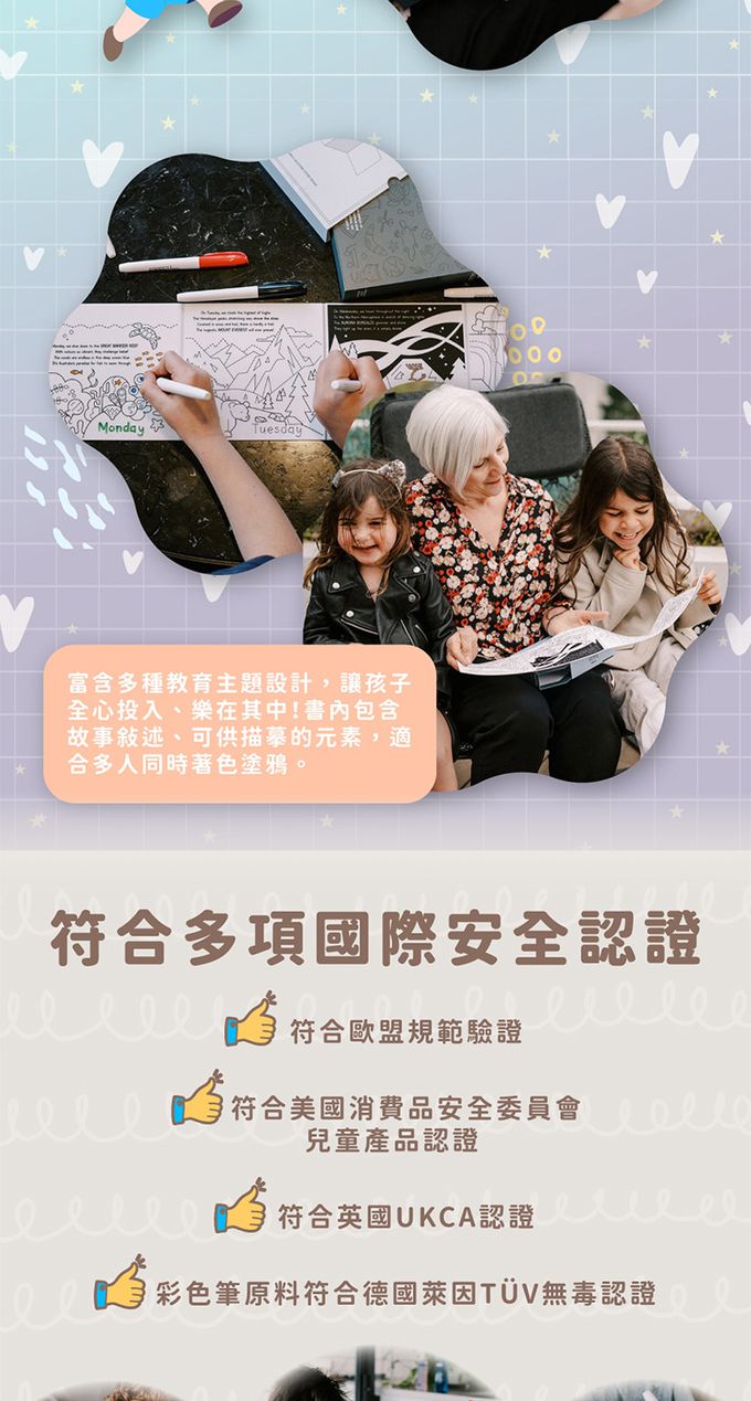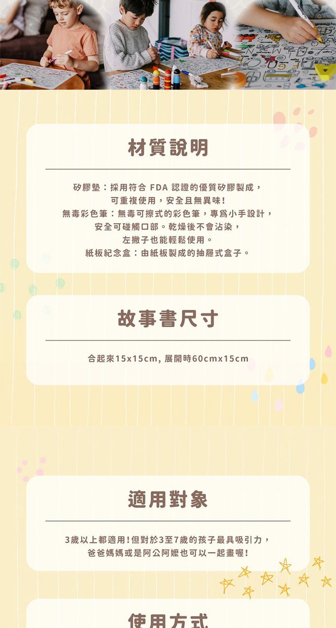 材質:[畫墊]矽膠、[彩色筆]塑膠、墨水、[紀念盒]紙質