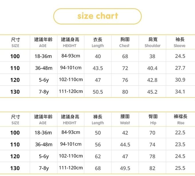 1. 尺寸表單位皆為公分(cm),實際尺寸會因布料彈性、水洗、測量起迄點等因素略有誤差。建議參考孩子平時穿著衣物尺寸進行選購。