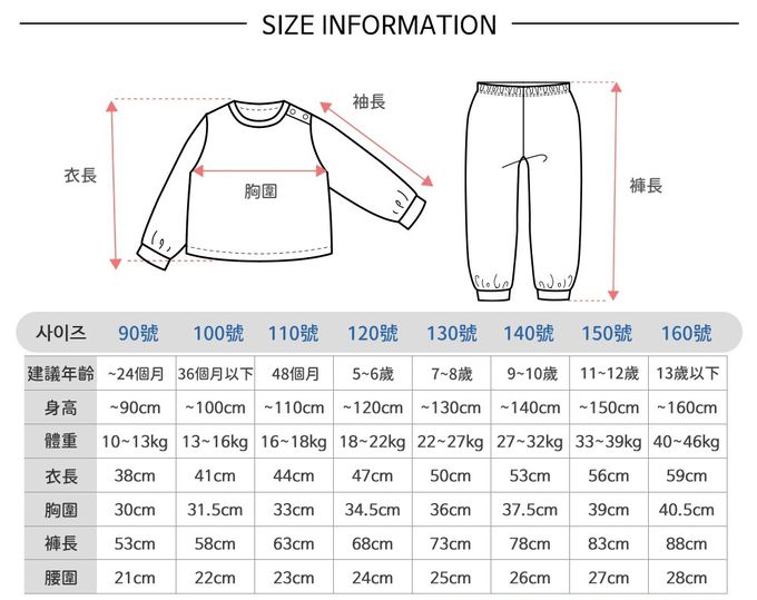90[身高~90cm;體重10~13kg]、100[身高90~100cm;體重13~16kg]、110[身高100~110cm;體重16~18kg]、120[身高110~120cm;體重18~22kg]、130[身高120~130cm;體重22~27kg]、140[身高130~140cm;體重27~32kg]、150[身高140~150cm;體重33~39kg]、160[身高150~160cm;體重40~46kg]