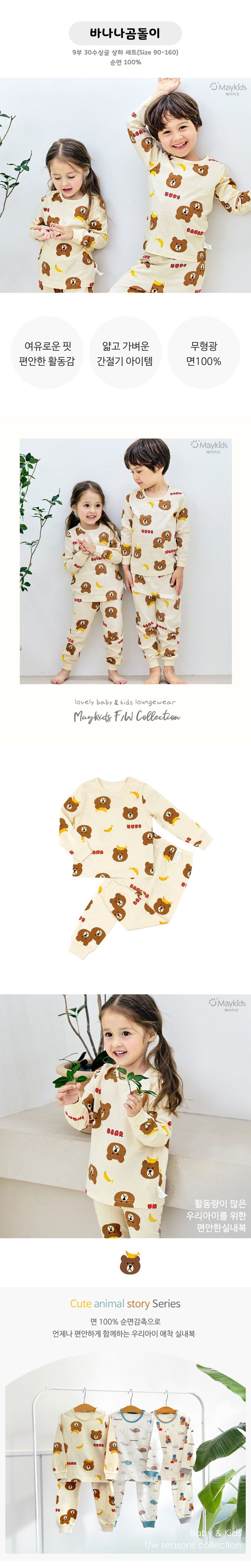 韓國 Maykids - 細緻柔棉薄長袖家居服-香蕉熊熊-米黃