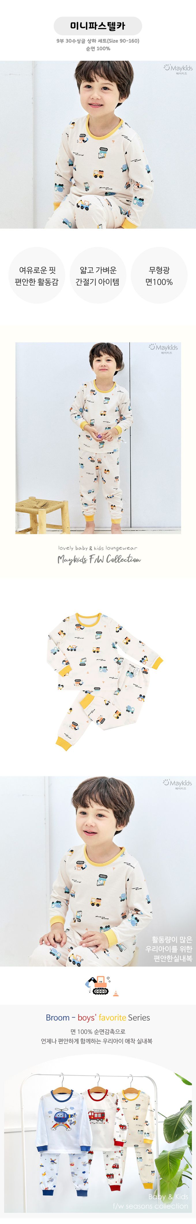 韓國 Maykids - 細緻柔棉薄長袖家居服-迷你工程車-米膚