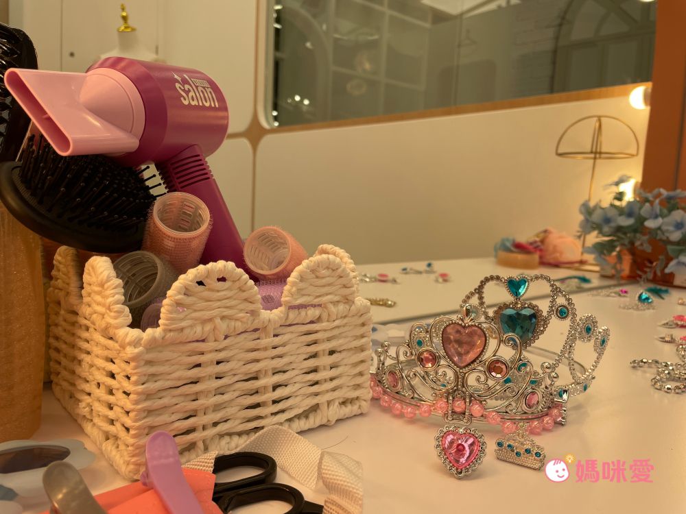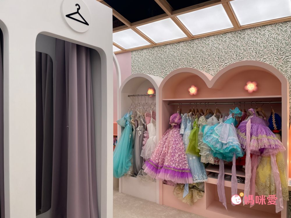 旁邊有一個氛圍燈大梳妝台,擺放各式皇冠、耳環配件,換上禮服站在這就是公主的化身無誤,小孩來這區換裝媽媽們手機可以拍好拍滿,太可愛了~