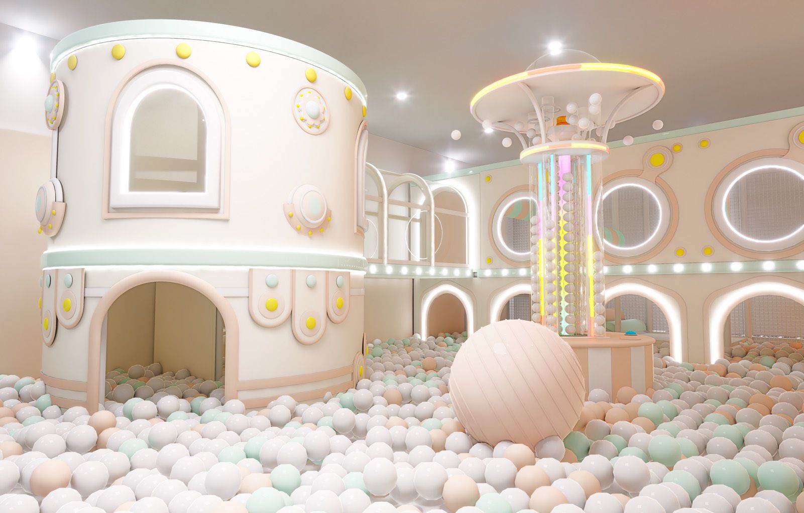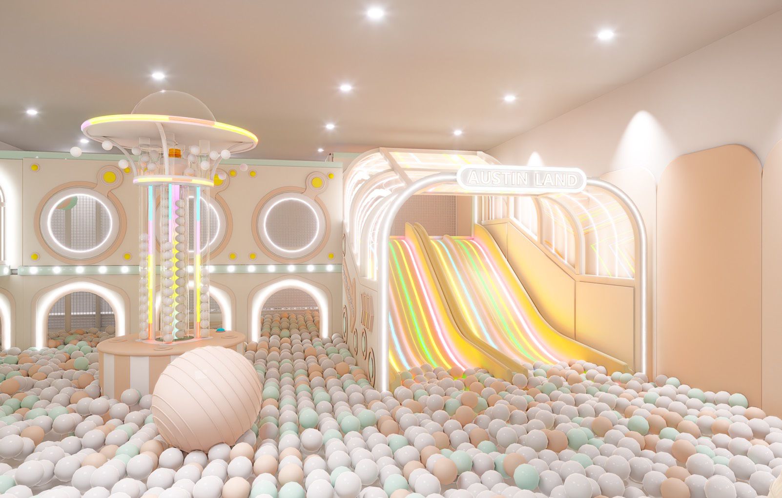 總計共250坪的大空間、氛圍10大區域,有超大球池、主題遊樂設施、親子共學、特色餐飲、機台遊戲區等一應俱全!讓空間充滿生命,讓您彷彿走進一座大型的藝術殿堂,激盪出無限創意,是孩子們的小天地,無限的創意讓您在這裡可以無限發揮!