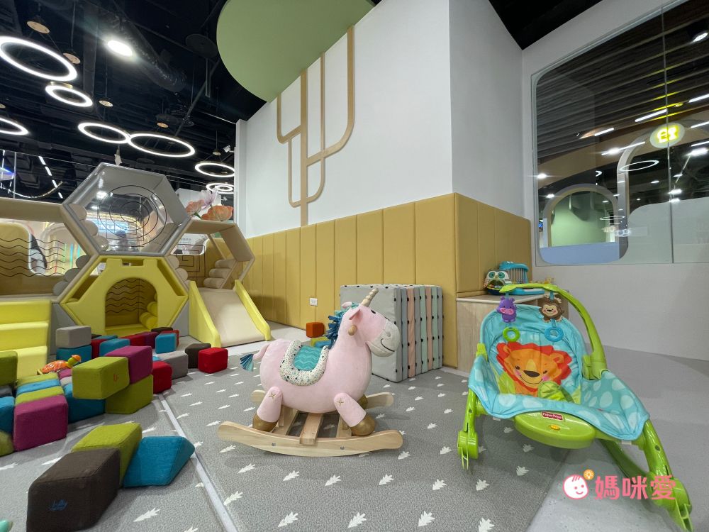 「蜂巢幼兒專區」適合月齡較小的寶寶們,地板有軟墊、牆面也有作防撞設計,還有品牌安撫椅及搖搖馬,帶小寶寶的媽媽們在這可以解放雙手,讓寶寶在地上爬行也很安全