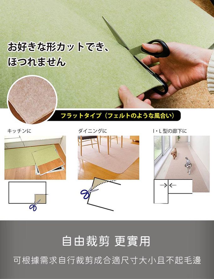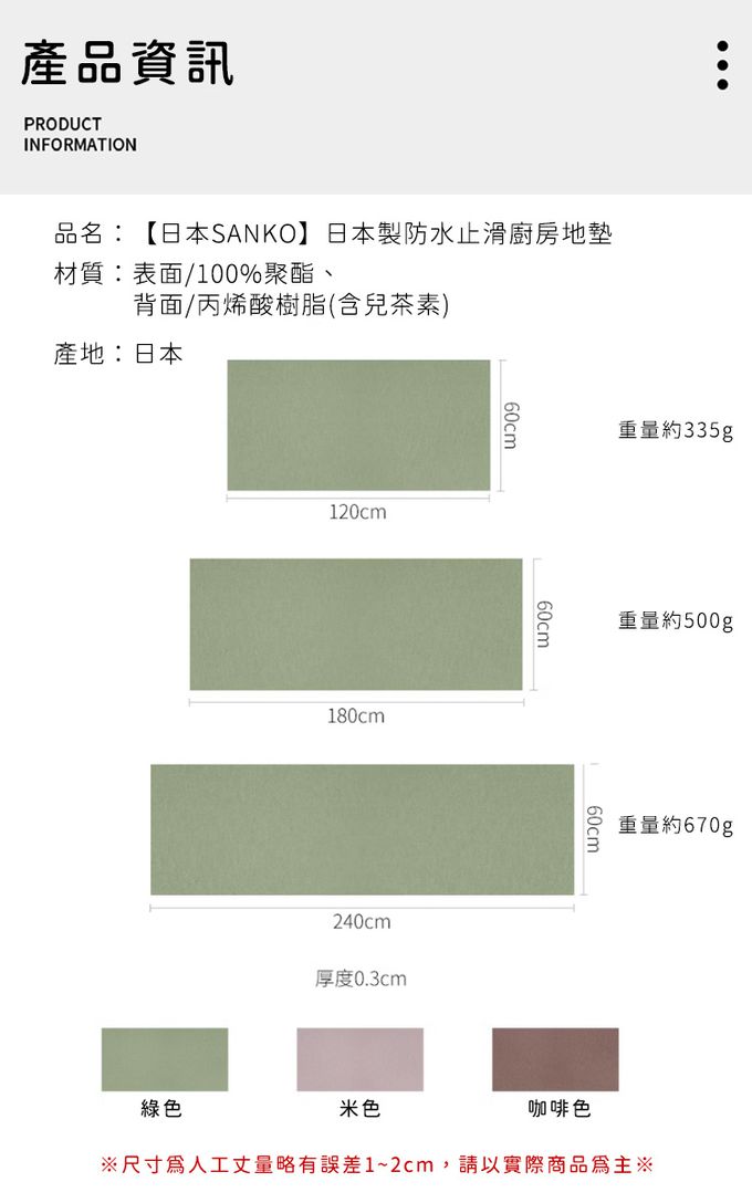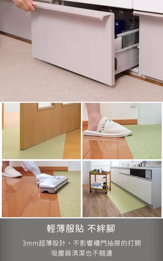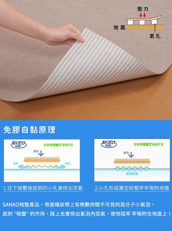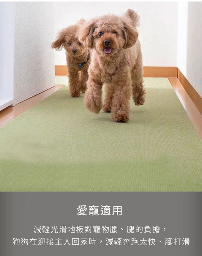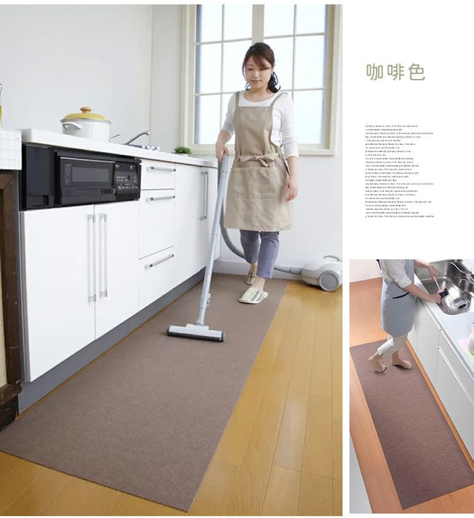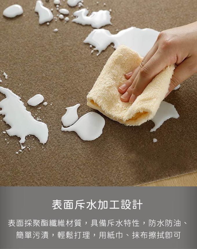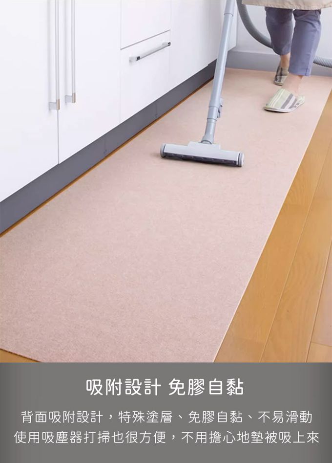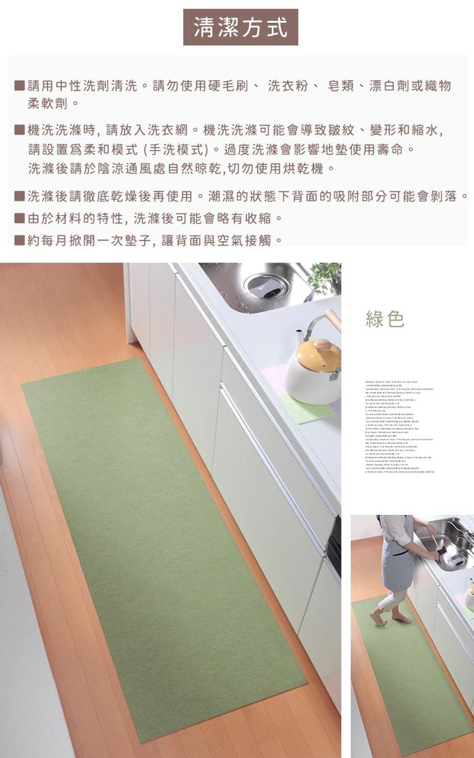 注意事項:1.請用中性洗劑淸洗。請勿使用硬毛刷、洗衣粉、皂類、漂白劑或織物柔軟劑。 2.機洗洗滌時,請放入洗衣網。機洗洗滌可能會導致皺紋、變形和縮水,請設置為柔和模式(手洗模式)。過度洗滌會影響地墊使用壽命。洗滌後請於陰涼通風處自然晾乾,切勿使用烘乾機。 3.洗滌後請徹底乾燥後再使用。潮溼的狀態下背面的吸附部分可能會剝落。 4.由於材料的特性,洗滌後可能會略有收縮。 5.約每月掀開一次墊子,讓背面與空氣接觸。 注意事項 1.商品到貨享鑑賞期之權益,鑑賞期並非試用期,辦理退貨商品必須是全新狀態且紙箱及商品配件包裝須完整。商品一經使用或組裝後,恕無法辦理退換貨。 2.商品為人工丈量略有1~3公分內誤差,請以實品為主。 3.網頁商品會因面板螢幕解析度不同,造成圖片顏色呈現略有不同,請以實品顏色為準。 4.產品表面為防水加工,但不適宜長時間有水,灑濺後請即刻清理。 5.請勿在表面粗糙的地板、塗漆地板或老化地板上使用。 6.背面丙烯酸樹脂材質凸起處會形成無數個細小吸盤吸附於地面,如有打蠟(尤其是固體蠟),潮溼、水氣等會影響吸附能力,儘量在乾淨、保持乾燥的環境使用,如打蠟請在鋪設後檢查吸附效果。 7.淸洗時請使用中性洗滌劑,建議不要使用洗衣粉以及含有漂白、增白、柔順等含有化學成分的洗滌劑 8.使用環境溫度不得低於0°C 潮濕建議不高於80%, 否則易產生水氣或結冰,影響吸附能力。請勿放置在靠近火源或高溫的地方。 9.機洗時請選擇"柔軟模式"(手洗模式)過度洗滌會影響壽命,洗滌後於陰涼通風處自然晾乾,嚴禁使用烘衣機。 10.如果是輕微髒污,建議使用清潔海綿等類似刷具配合中性洗滌劑稍微刷洗乾淨、晾乾即可,不可使用硬毛刷之類。