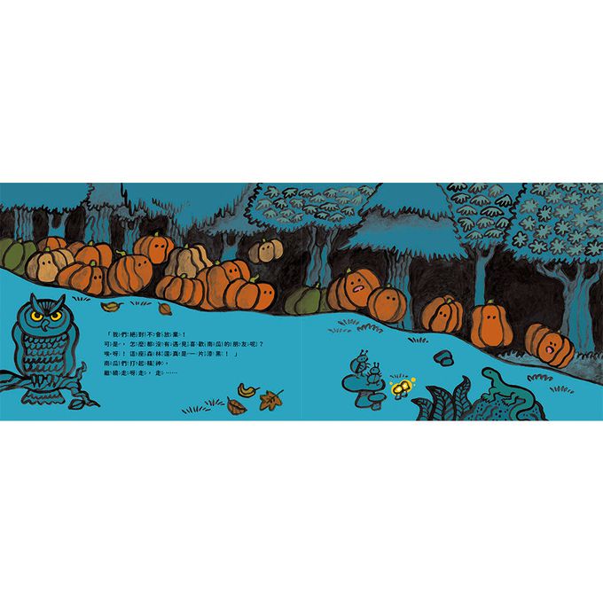 聽到老爺爺吃南瓜膩了,田裡的南瓜們好傷心,集體離家出走,但沿途遇到的動物都說不吃南瓜。失望的南瓜們走進黑森林後,咕嚕嚕!滾進一個洞,竟然遇到歡迎他們的朋友,還變變變,變出一場熱鬧的南瓜派對,南瓜反而成了這次萬聖節的主角。那沿路說不愛南瓜的動物們竟然聞香而來,究竟是什麼朋友讓南瓜變成大家的愛啊?繪本用飽和的色彩呈現南瓜滿滿的暖暖橘,也逗趣的呈現南瓜們的表情包,相信讀者看了會不時淡淡心酸、不時會心一笑……讓我們跟著南瓜們去探險,找到被擁抱的新天地。