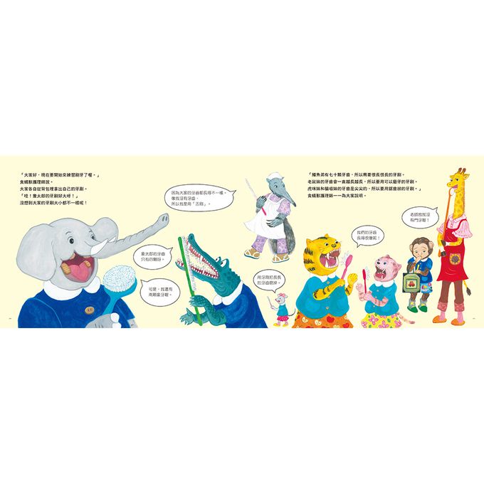 書中角色各自擁有符合其動物特性的牙齒與專屬牙刷(如:鱷魚需要長牙刷、老鼠需要可磨牙的刷子),不僅生動有趣,也巧妙穿插「動物牙齒知識」,讓孩子在閱讀中吸收科普常識。