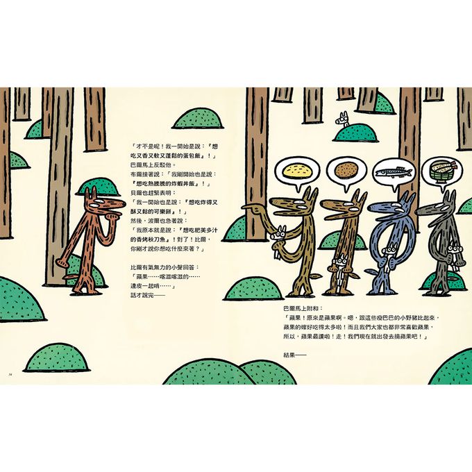 宮西達也以一貫充滿童趣與巧思的畫風,從封面到封底皆埋藏呼應與轉折的巧妙設計,例如野狼疊羅漢採蘋果、分工搬運的畫面,展現他對故事整體結構與視覺敘事的高超掌握。這種圖文並進的手法,讓孩子在閱讀時更能發掘隱藏細節,激發觀察力與思辨力。