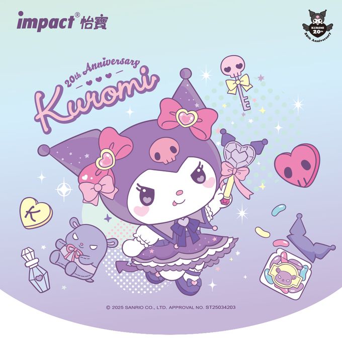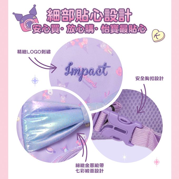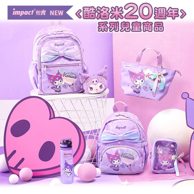 為慶祝三麗鷗人氣角色酷洛米Kuromi 迎來20週年紀念,impact怡寶推出期間限定圖樣,炫彩緞帶系列夢幻甜美!適合當幼兒園書包、出遊背出門,絕對能感受到熾熱視線,酷洛米迷一定要入手的包款