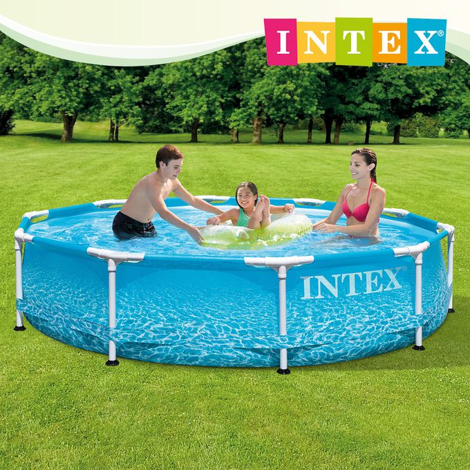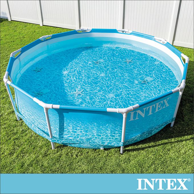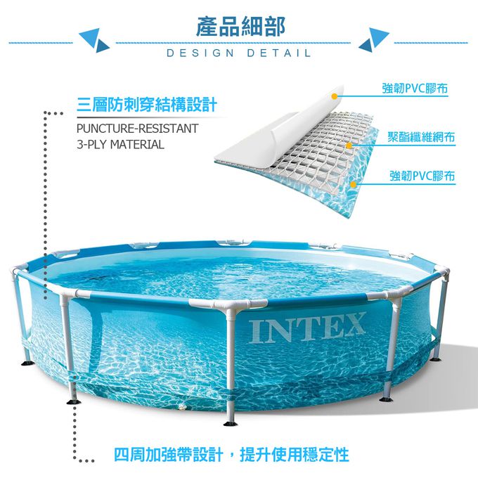 這款 INTEX 海濱框架泳池,採用 堅固鋼骨架 + 三層防刺穿PVC底布,搭配海洋風印花設計,耐用又好看,隨附濾水泵讓水質清澈,天天都能暢快玩水。