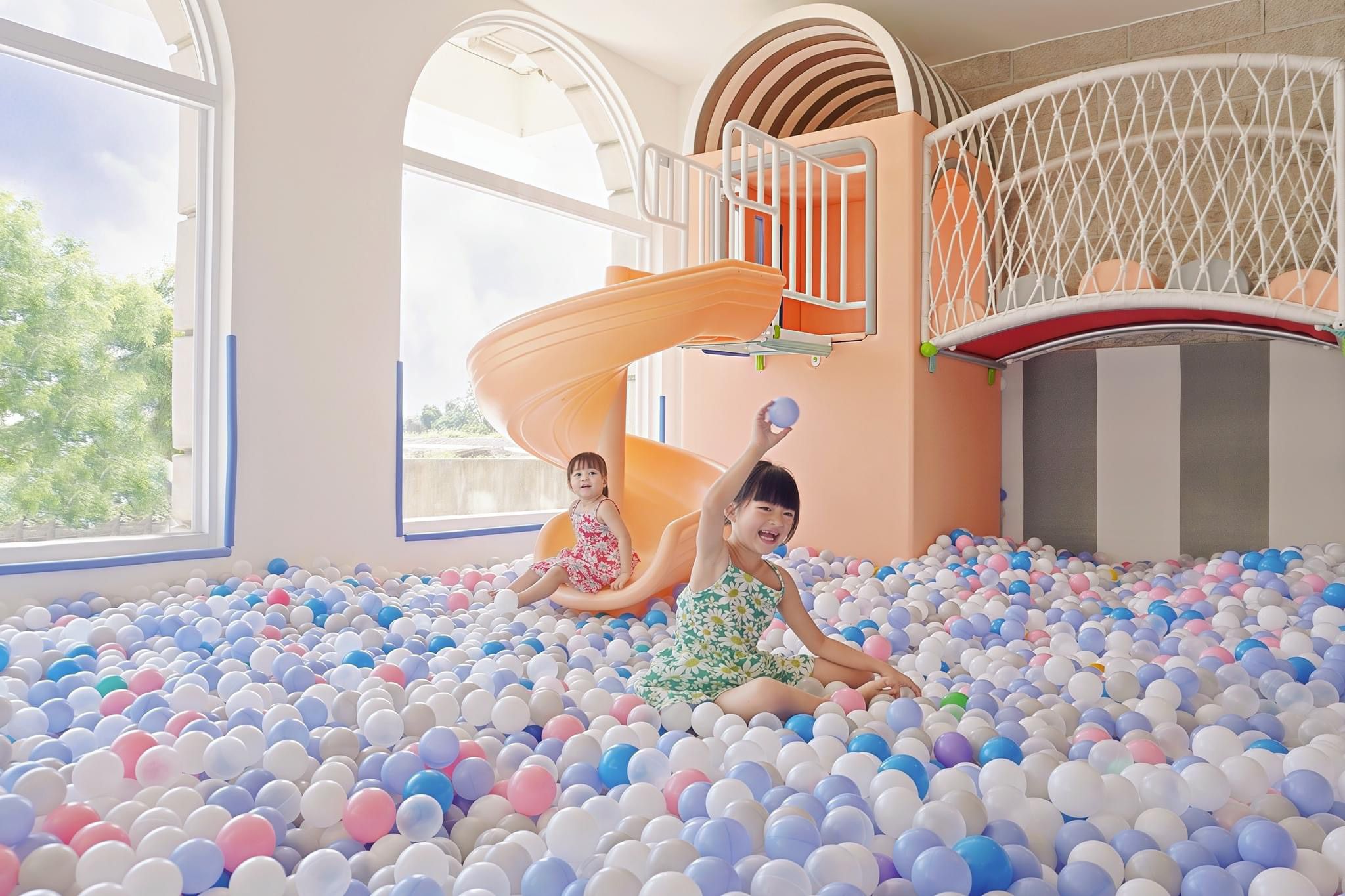 【礁溪白宮渡假勝地】最具特色的就是他們家擁有超多戶外活動設施大草原上的泡泡球是最熱門的親子遊戲!不管大人小孩都能玩得超盡興!因為腹地廣大的關係,旅宿也非常大氣地配備了超多電動遙控汽車/摩托車,室內也有專為小小孩設計的球池溜滑梯遊戲區。