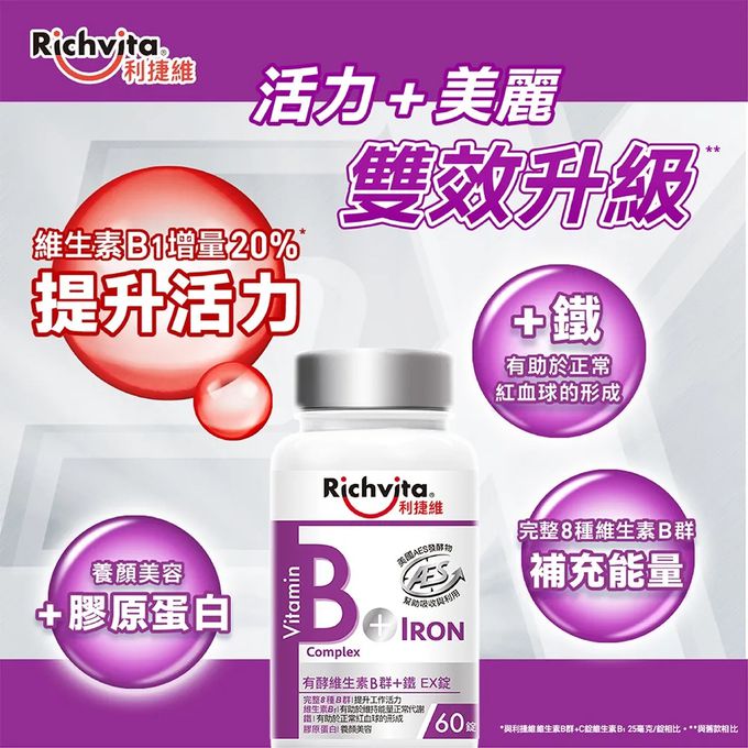抗壞血酸(維生素C)、菸鹼醯胺、丁烯二酸亞鐵、硝酸硫胺明(維生素B1)、核黃素(維生素B2)、聚乙烯?咯烷酮、本多酸鈣、羥丙基甲基纖維素、鹽酸?哆辛(維生素B6)、二氧化矽、硬脂酸鎂、聚乙二醇、二氧化鈦、葉酸、食用黃色五號鋁麗基、食用紅色四十號鋁麗基、生物素、氰鈷胺明(維生素B12)。