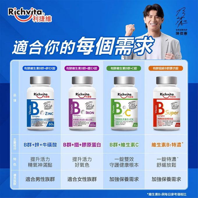 【食品添加物】抗壞血酸(維生素C)、菸鹼醯胺、牛磺酸、硝酸硫胺明(維生素B1)、核黃素(維生素B2)、聚乙烯?咯烷酮、本多酸鈣、氧化鋅、羥丙基甲基纖維素、二氧化矽、硬脂酸鎂、鹽酸?哆辛(維生素B6)、聚乙二醇、二氧化鈦、食用紅色四十號鋁麗基、食用藍色一號鋁麗基、葉酸、生物素、氰鈷胺明(維生素B12)。