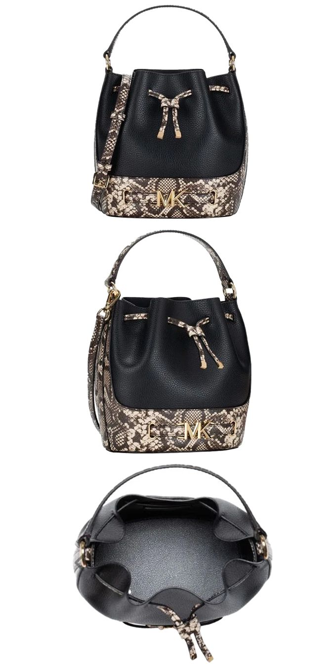 拼接蛇紋皮革水桶兩用包 (黑)