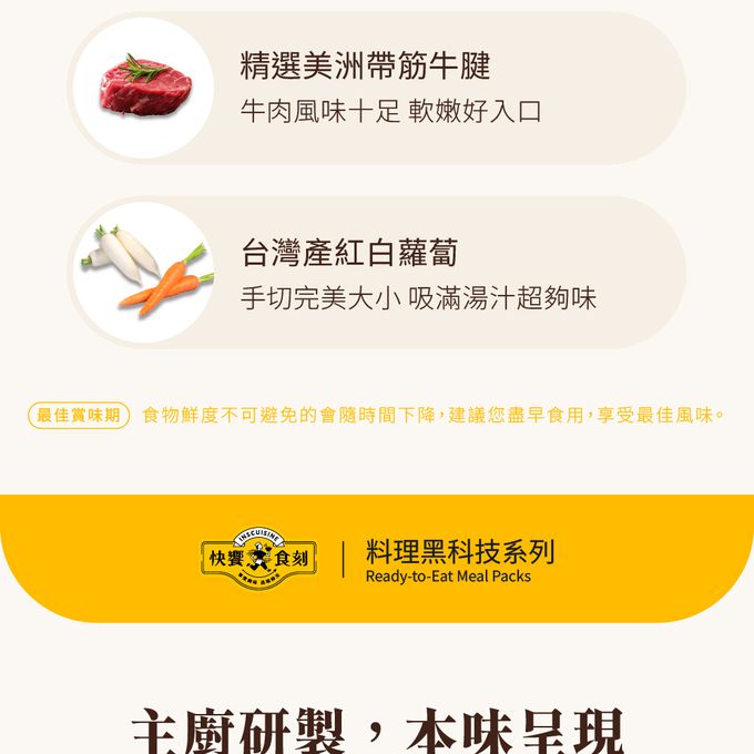 成分:水、牛肉(巴拉圭)、紅蘿蔔、白蘿蔔、大豆油、洋蔥、米酒、蔗糖、乙醯化己二酸二澱粉(黏稠劑)、醬油、豆瓣醬(黃豆(非基因改造)、米、小麥、鹽、辣椒、焦糖色素(著色劑))、鹽、蒜頭、番茄糊(番茄糊、檸檬酸)、L-麩酸鈉(調味劑)、薑、朝天椒、八角。