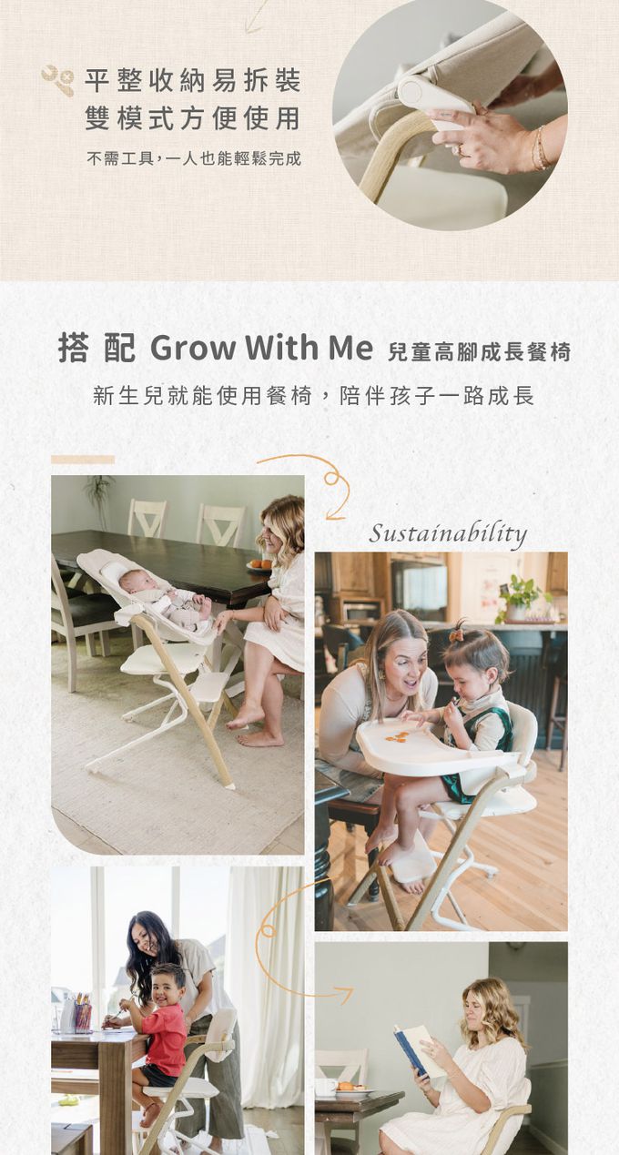 亦可搭配 Grow With Me 高腳成長餐椅使用,陪伴寶寶從新生一路成長,是育兒路上的安心好幫手。