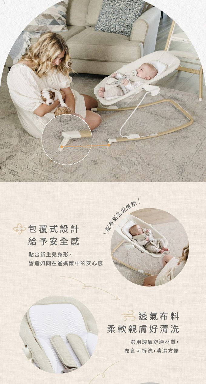 三段式角度調整,從餵奶、安撫到互動玩耍皆宜;可搖可固定模式,自然安撫寶寶情緒,也穩定支撐小睡與餵食時光。