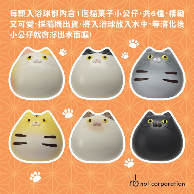 每顆入浴球都內含1個貓菓子小公仔,共6種,精緻又可愛,採隨機出貨,將入浴球放入水中,等溶化後小公仔就會浮出水面喔! 會出現哪個呢? 一起來收集吧!