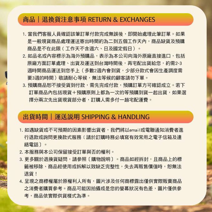 預購商品:預購為海外同步代購,遇缺貨即會通知媽咪並協助取消退款事宜。
