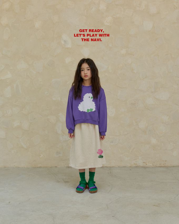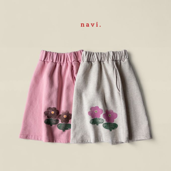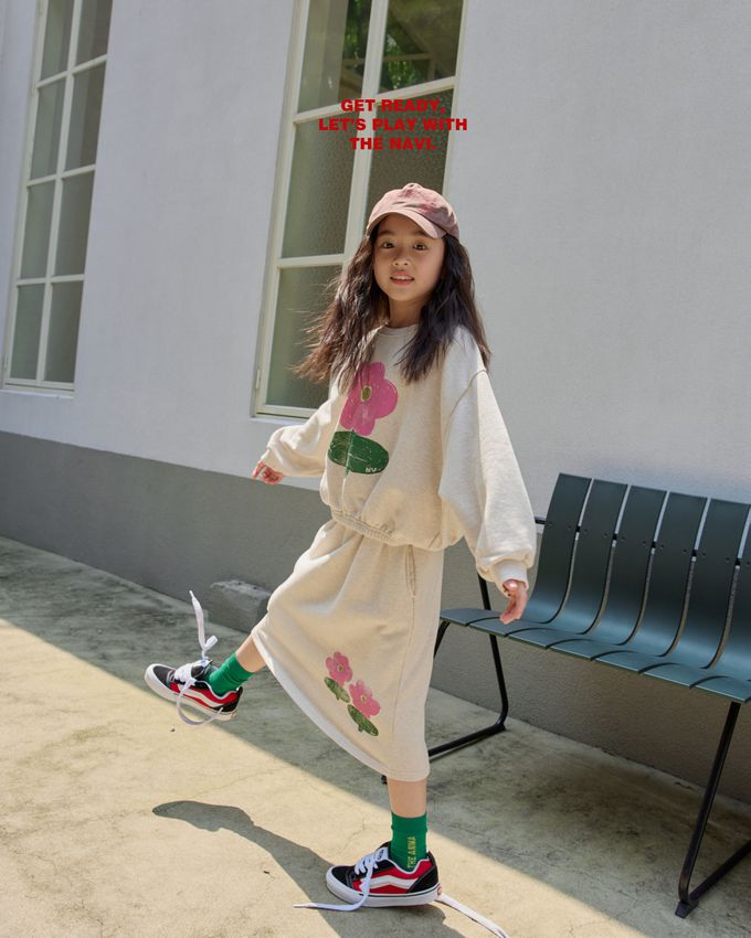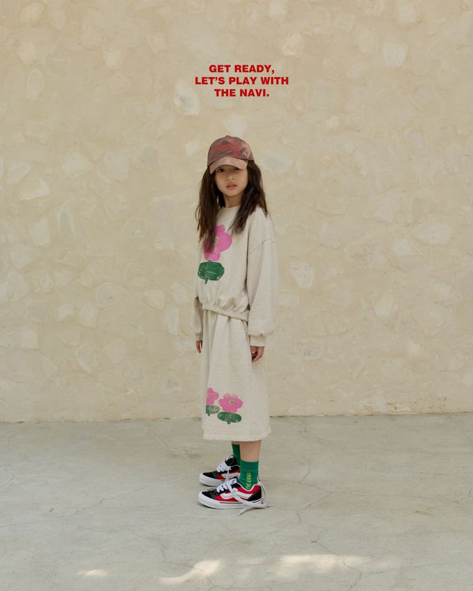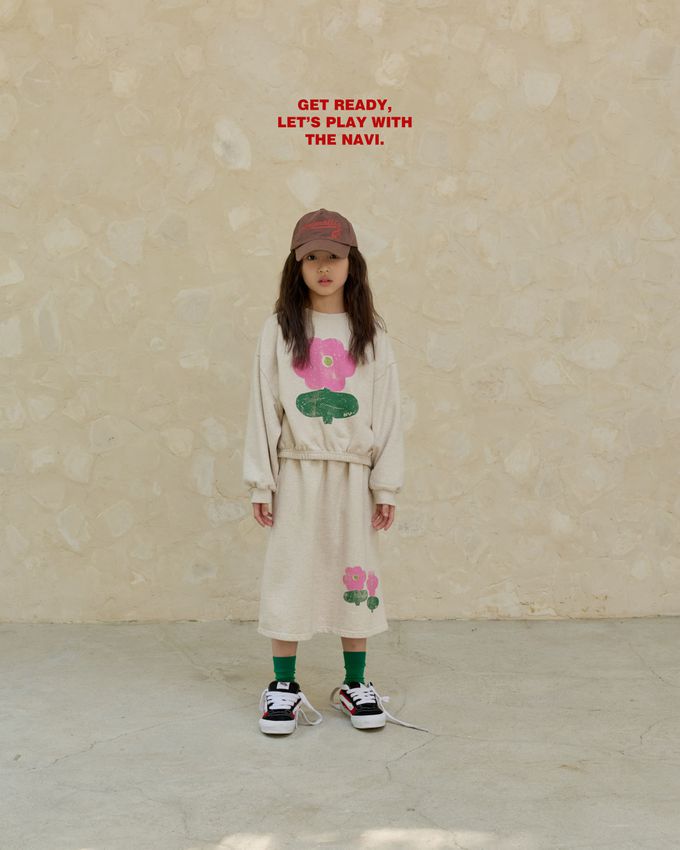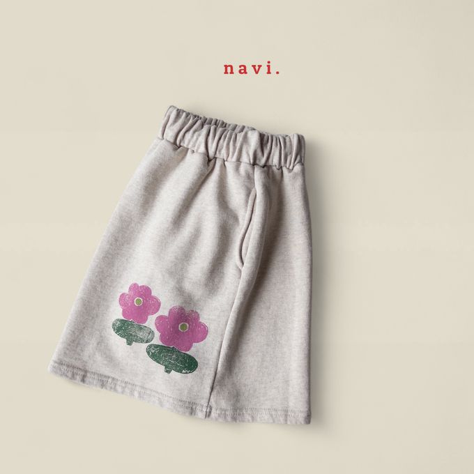 韓國南大門童裝 - NAVi 鬆緊腰塗鴉花朵印純棉中長裙-燕麥