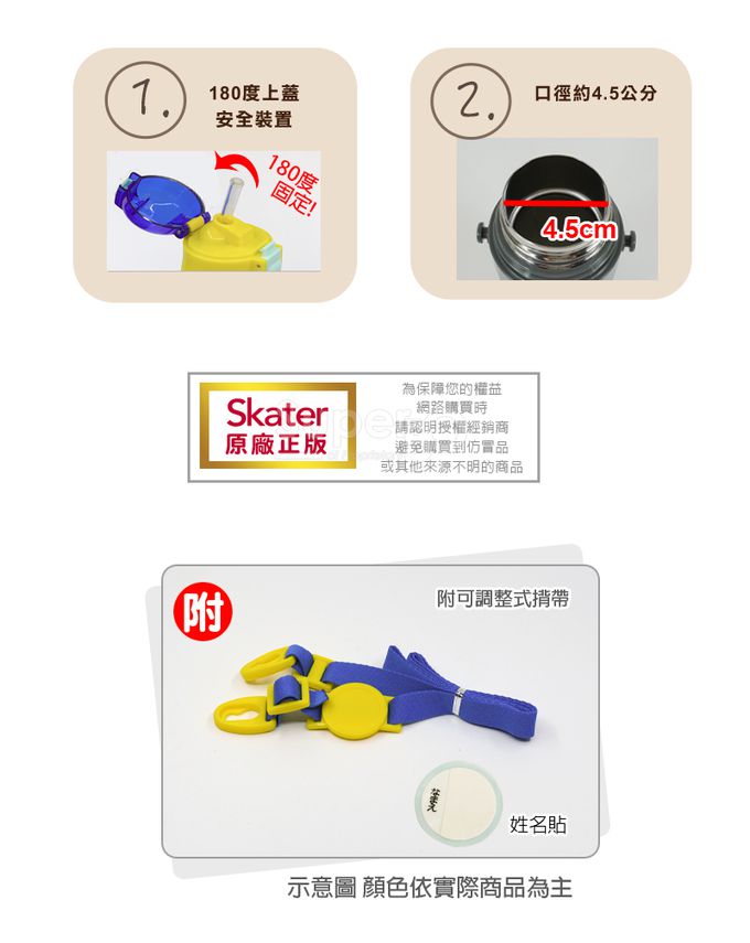 注意事項:1、不可加熱,不可微波! 2、請以海綿清洗,勿用鋼刷或硬質物洗滌,以免刮傷,並自然陰乾。 3、不可使用於洗碗機、烘碗機、消毒鍋,並勿接近火爐,以免褪色,或透溫(失去保溫功能)。 4、雙層真空不鏽鋼容器,皆具有保冷保溫功能,吸管型水壺,切勿注入高溫飲品,因環境溫差壓力可能會導致飲品溢出。 5、為避免燙口,燙傷或其他不當使用等意外,故包裝僅標示 保冷專用。