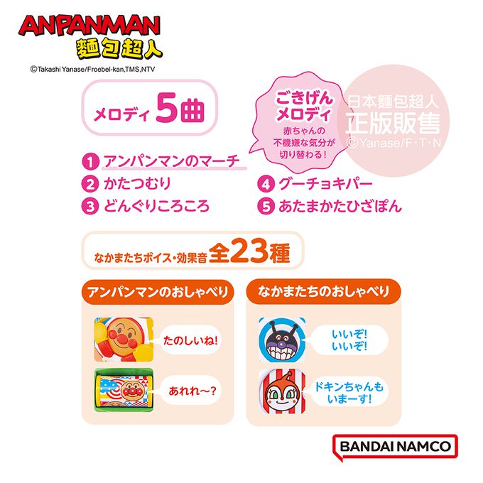 2.麵包超人的對話聲音;3.音樂遊戲(共5首音樂旋律);4.紅精靈轉轉旋鈕;