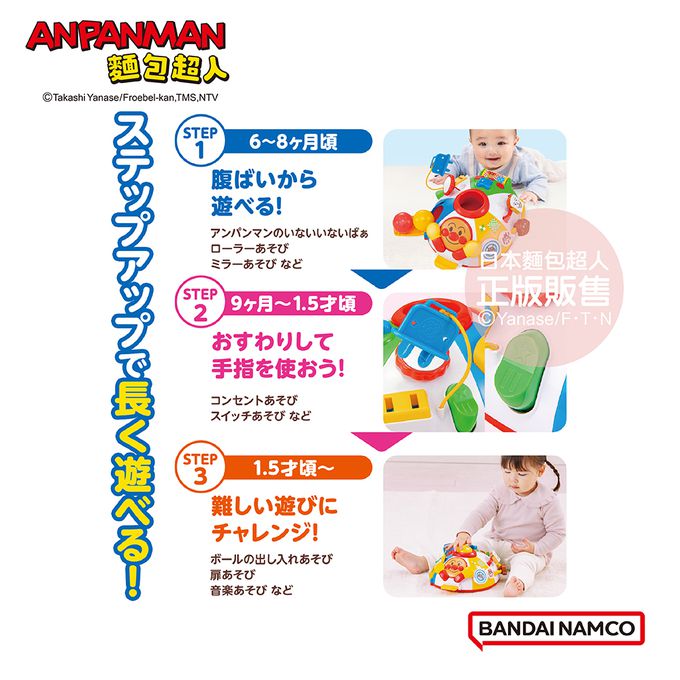 STEP 1:6~8個月左右:從爬行期開始就可以玩耍!例如:麵包超人的表情捉迷藏、滾筒、鏡子..等。