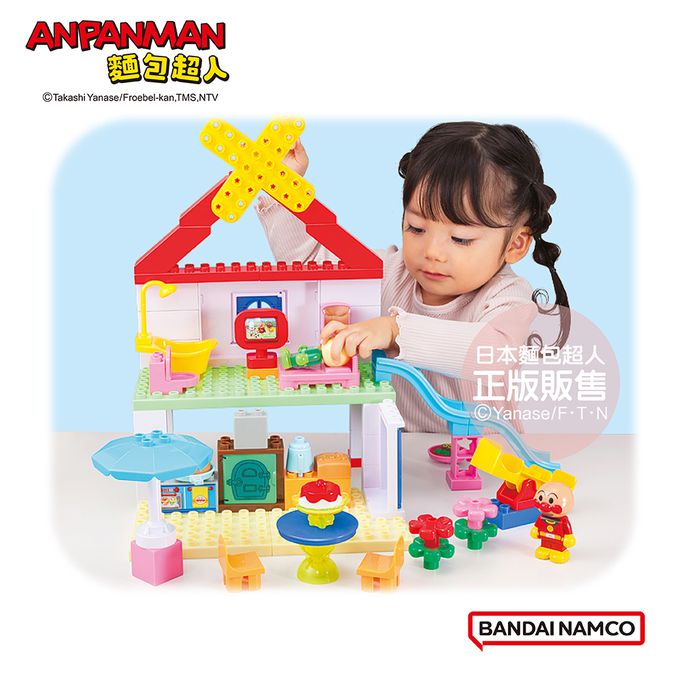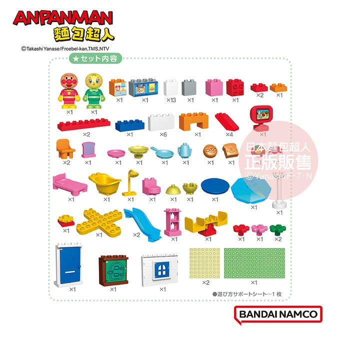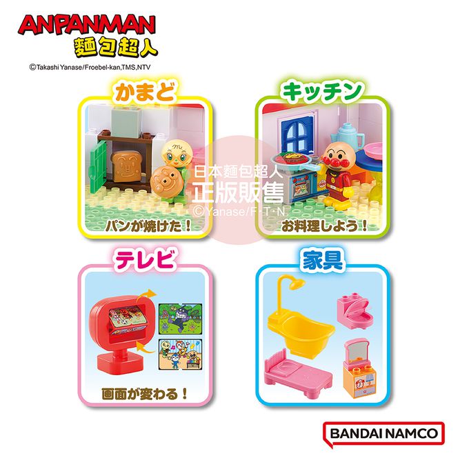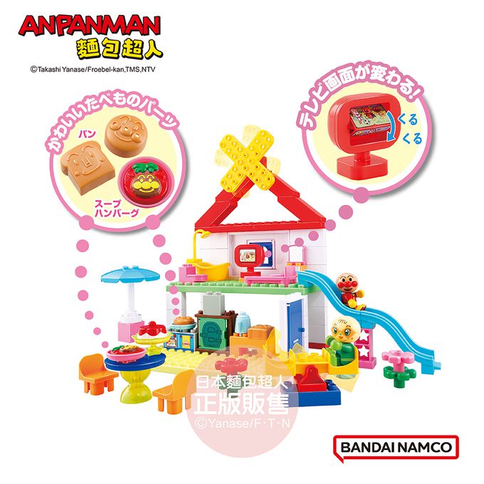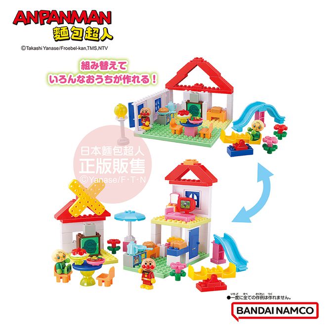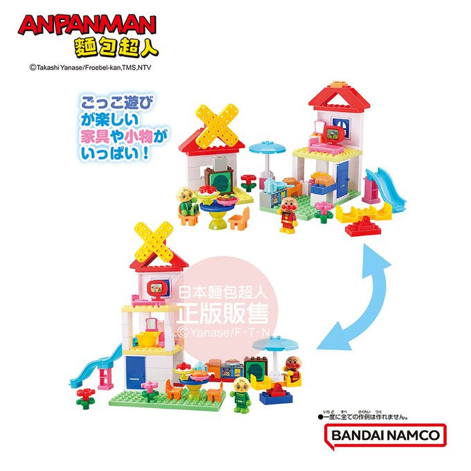內附2個人偶(麵包超人、蜜瓜超人)、3種可愛的料理(麵包、土司、漢堡排)、窯爐、廚房、電視、家俱…多種積木配件等,運用小道具,發揮想像力,烤麵包、做料理、電視的畫面還可變換,還有家俱的擺設、溜滑梯…等多種玩法,豐富又有趣,動動腦力,發揮創意,打造屬於自己專屬的大房子吧!