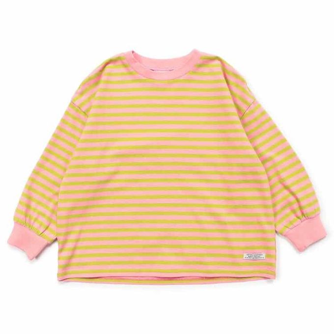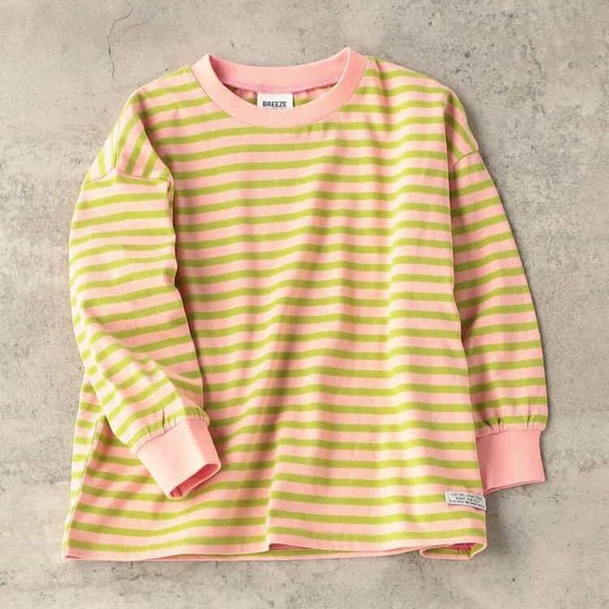 日本 BREEZE - 100%棉 定番款搭縮口長袖上衣-條紋-粉紅X草綠